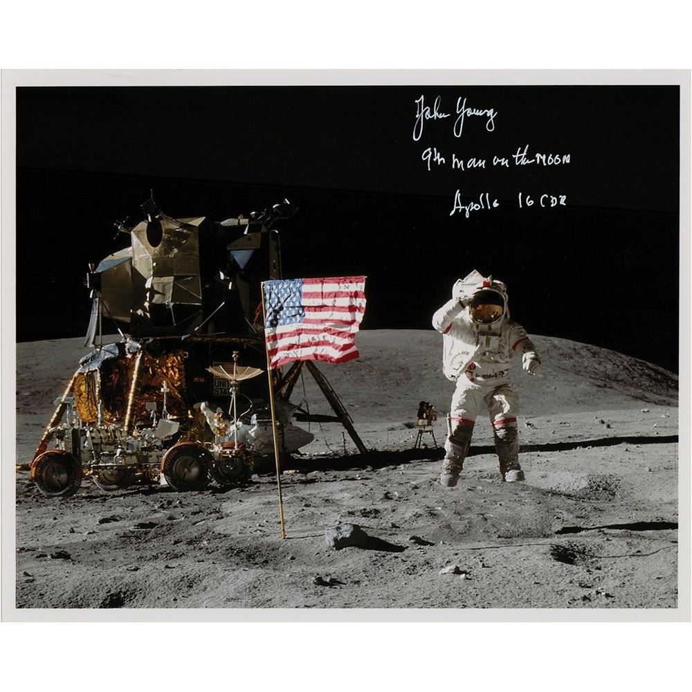 Color satin-finish 10 x 8 photo of moonwalker John Young saluting the American flag and leaping from the lunar surface during the Apollo 16 mission, signed in white ink, "John Young, 9th man on the moon, Apollo 16 CDR." In very fine condition.