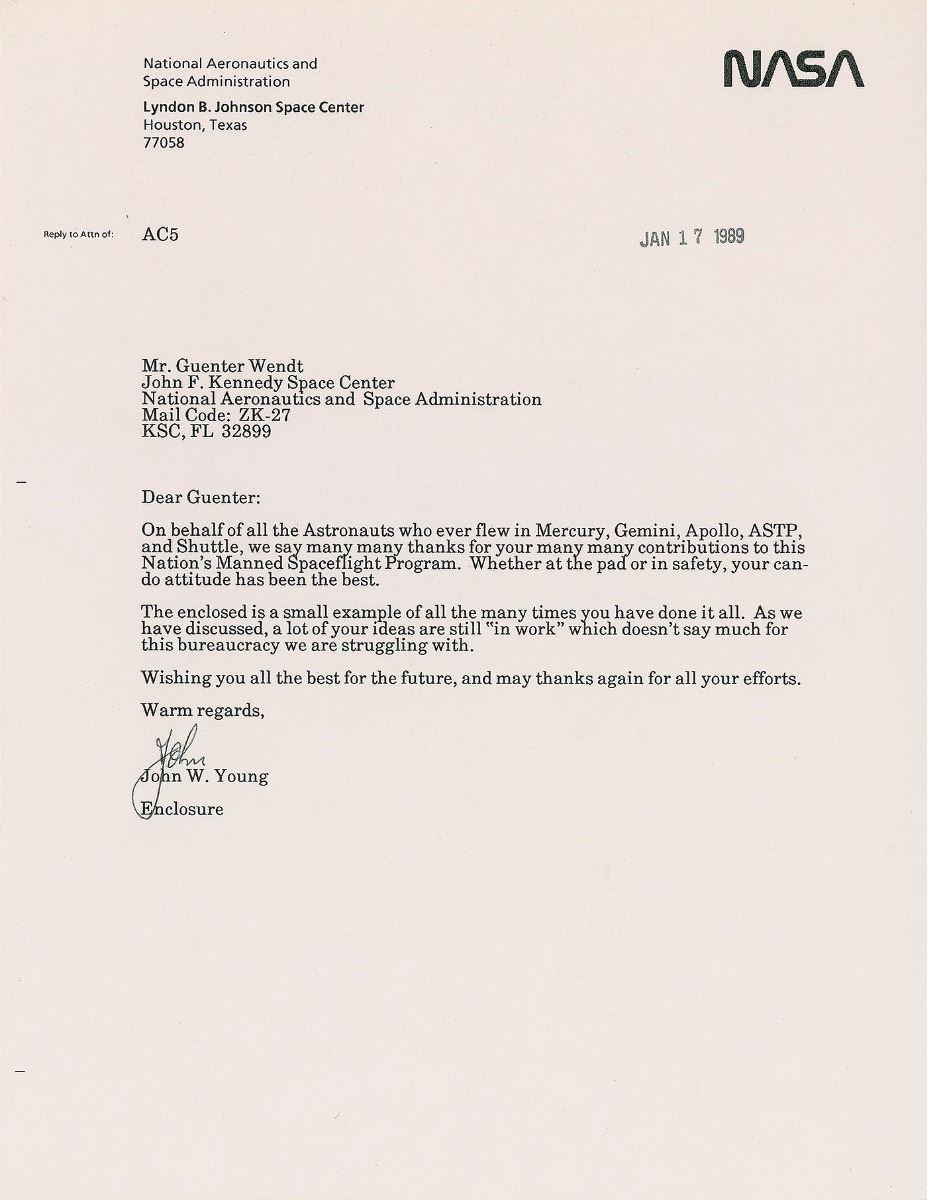 TLS signed “John,” one page, 8.5 x 11, NASA letterhead, January 17, 1989. Letter to Guenter Wendt. In part: “On behalf of all the Astronauts who ever flew in Mercury, Gemini, Apollo, ASTP, and Shuttle, we say many thanks for your many many contributions to this National s Manned Spaceflight Program. Whether at the pad or in safety, your can-do attitude has been the best.” In fine condition. The Guenter Wendt Collection, ex. Ken Havekotte.