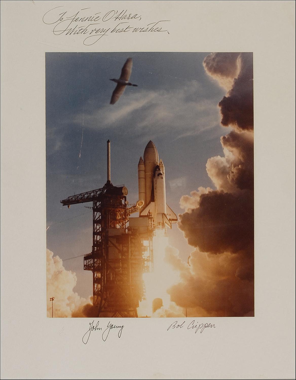 Color glossy 11 x 14 photo of the first lift-off of Columbia, affixed to its original 16 x 20 mount, signed and inscribed in black ink in an unknown hand “To Jeannie O’Hara, With very best wishes,” and signed in the lower border in black felt tip by John Young and Bob Crippen. Vertical scratch to left side of image, mild rippling to horizontal edges, some light damp staining along bottom edge, and a mild shade of overall toning to mount from previous display, otherwise fine condition.