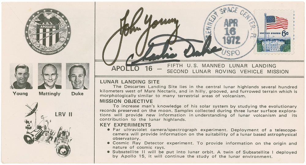 VIP launch card, 6.5 x 3.5, honoring Apollo 16, signed in black felt “John Young” and “Charlie Duke.” In fine condition, with corner bumps.