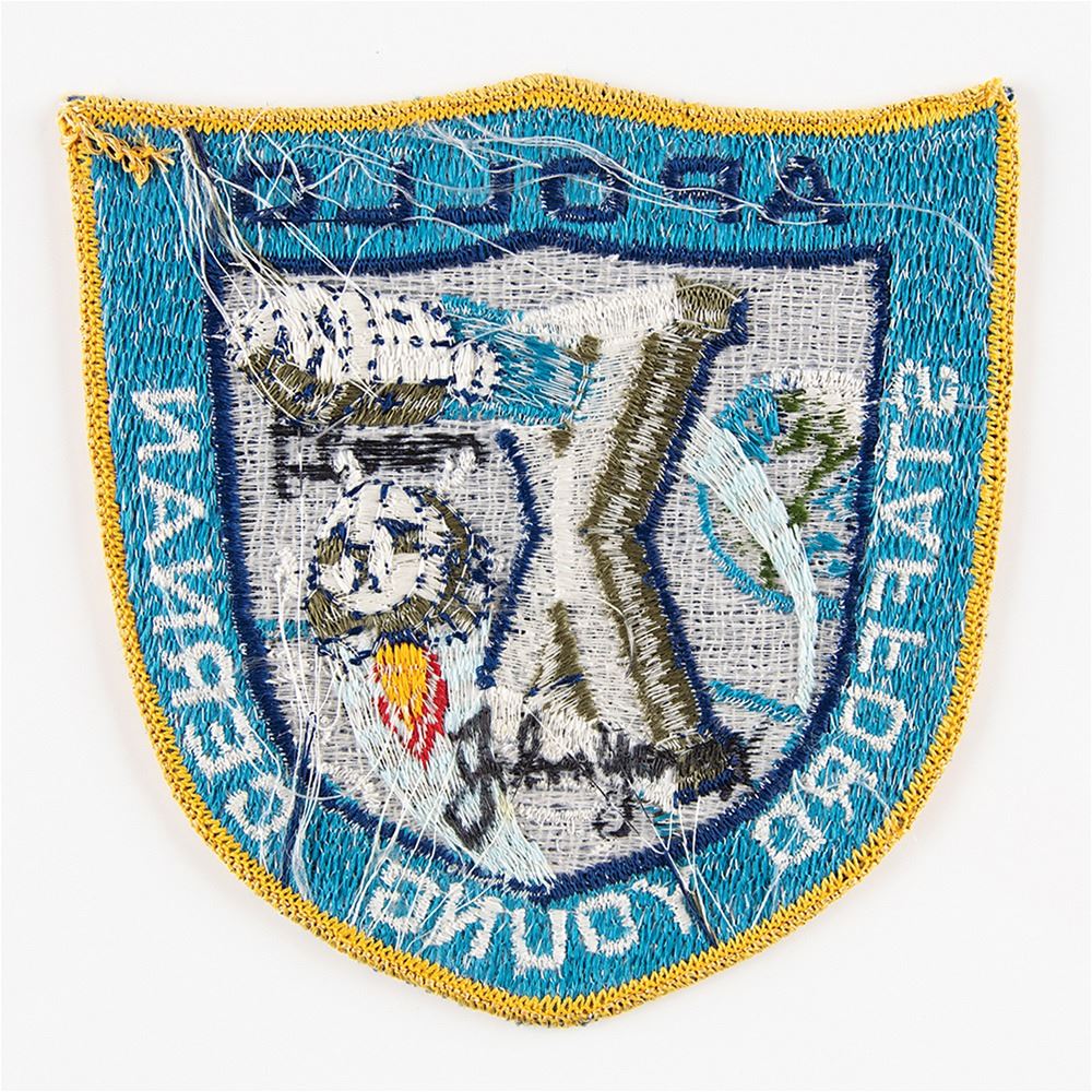 Extremely desirable flown embroidered 'Grumman' Apollo 10 mission insignia patch carried to the moon on Apollo 10, measuring 4 x 4, signed and flight-certified on the reverse in black felt tip, "Flown, John Young." In fine condition. These attractive patches, which vividly portray the Grumman-made LM firing its thrusters as it prepares to dock with the Rockwell-made CSM, were provided to the crew by Grumman to be flown as souvenirs. A handsome example from the collection of the prolific American astronaut, who first traveled to the moon on Apollo 10 and walked upon the lunar surface on Apollo 16.
