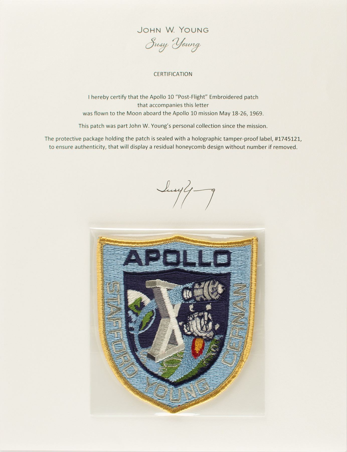 Very desirable flown embroidered ‘Post-Flight’ Apollo 10 mission insignia patch carried to the moon on Apollo 10, measuring 4 x 4.5, encapsulated in a tamper-proof sleeve and affixed to a certificate of authenticity signed by Susy Young, the wife of the late Command Module Pilot John Young, in part: "I hereby certify that the Apollo 10 ‘Post-Flight’ Embroidered Mission patch that accompanies this letter was flown to the Moon aboard the Apollo 10 mission May 18-26, 1969. This patch was a part of John W. Young’s personal collection since the mission." In fine condition. These attractive patches, which vividly portray the Grumman-made LM firing its thrusters as it prepares to dock with the Rockwell-made CSM, were worn on post-flight jumpsuits and flown as souvenirs. An uncommon example from the collection of the prolific American astronaut, who went to the moon on Apollo 10 and walked upon the lunar surface on Apollo 16.