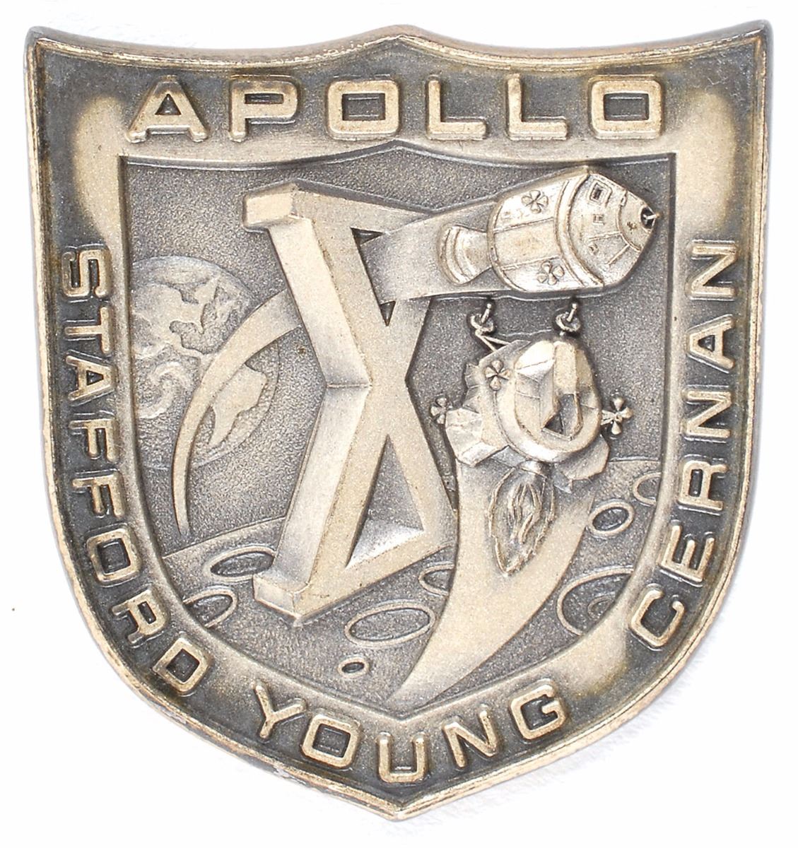 Flown sterling silver Apollo 10 Robbins Medal, approximately 1.25 x 1.25, with a raised design on the face of the mission insignia and the last names of crew members Tom Stafford, John Young, and Gene Cernan. The reverse of the sterling silver medal is engraved “May 18–26, 1969” and serial numbered “83.” Condition is mint state, with some expected light surface wear to reverse. Accompanied by a 2013 letter of authenticity from Apollo 10 CMP John Young, which reads: “I hereby certify that Apollo 10 silver Robbins Medal, serial number 83, was flown to the moon with me aboard the mission May 18-26, 1969 and has been a part of my personal collection since the mission.”