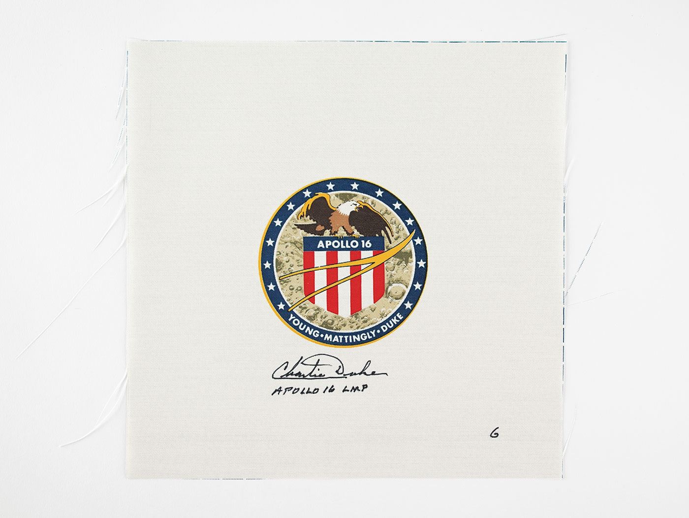 Desirable 9 x 9 swatch of Beta cloth featuring the Apollo 16 mission emblem from the collection of John Young, believed to have been flown on the mission, later signed in black felt tip, "Charlie Duke, Apollo 16 LMP," and numbered "6." In fine condition. Accompanied by a certificate of authenticity from Artifact Cloud, and a copy of a letter of provenance from Susy Young, wife of the late John Young, certifying that the original "sealed package of Apollo 16 Beta Cloth mission emblems…was among the few flown items that John had saved from the Apollo 16 mission. Although not specifically noted on the package, it was stored with his flown Apollo 16 items and I believe that it was flown." The Artifact Cloud certificate elaborates: "We obtained the entire sealed package of 25 beta cloth patches and Mr. Duke has numbered them #1 thru #25. Although Mr. Duke cannot attest the flown status he confirmed to us that the original sealed package looked similar to his flown Apollo 16 patch packages."