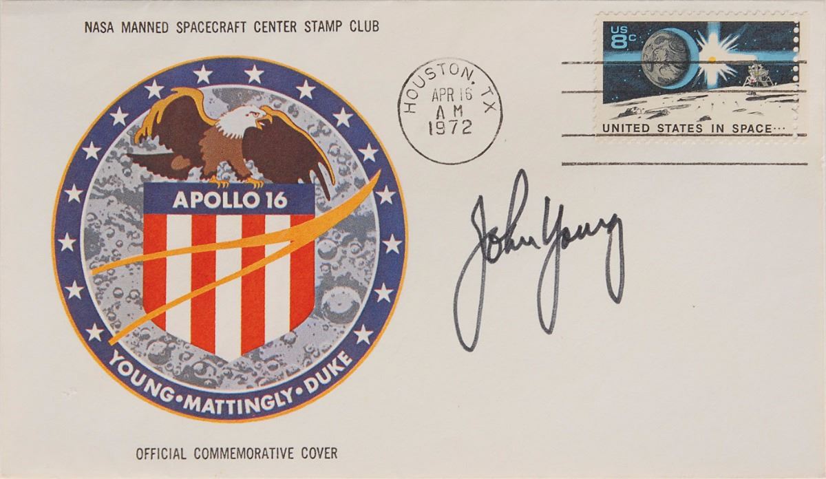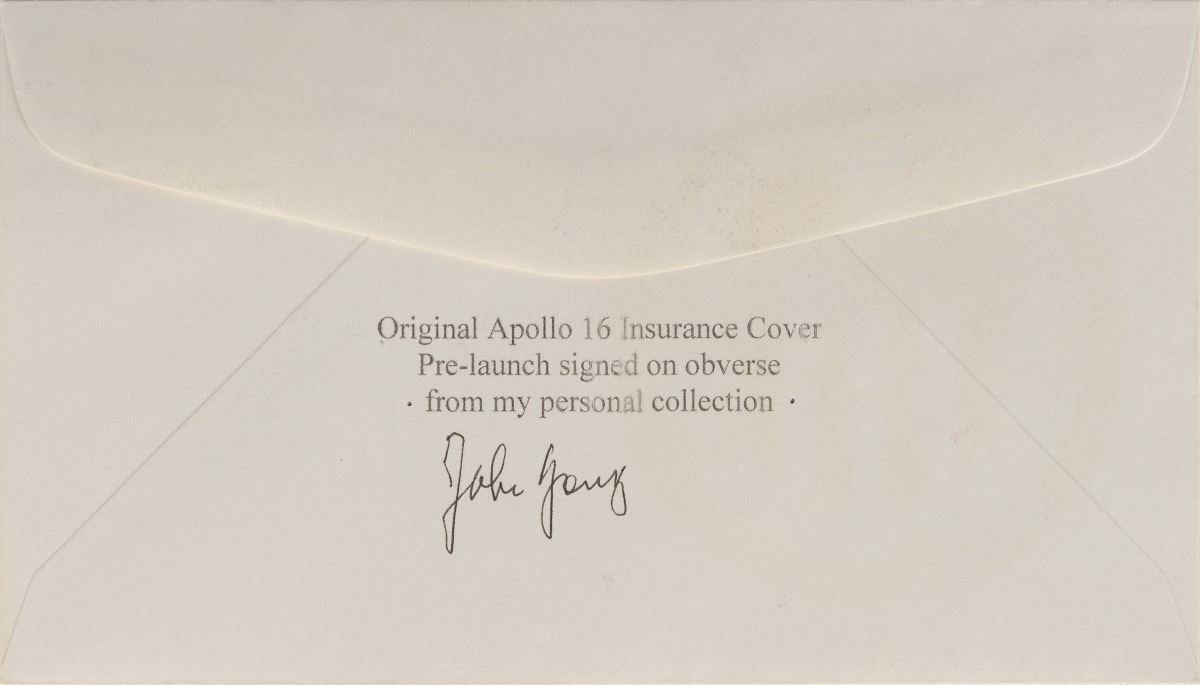 Desirable twice-signed Apollo 16 insurance cover with a cachet of the mission insignia, bearing an April 16, 1972 launch date postmark, signed in black felt tip by John Young. Also stamped on the reverse, “Original Apollo 16 Insurance Cover, Pre-launch signed on obverse from my personal collection,” signed below in black ink by Young. In fine condition.