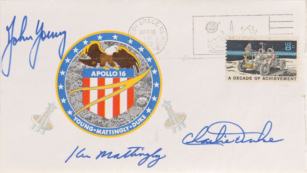 Very scarce Apollo 16 ‘Type 1’ insurance cover with a cachet of the mission insignia and two sets of astronaut wings, bearing an April 16, 1972, Kennedy Space Center launch date postmark, signed in blue felt tip by John Young, Charlie Duke, and Ken Mattingly. Uncharacteristically stamped on the reverse, “Original Apollo 16 Insurance Cover, Pre-launch signed on obverse from my personal collection,” signed below in black ink by Young. In fine condition. The majority of Apollo 16 insurance covers are not certified on the reverse like this superior example, which boasts exemplary vintage examples of the astronauts’ signatures.