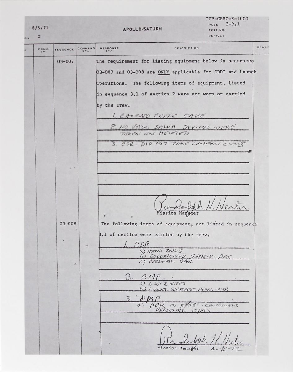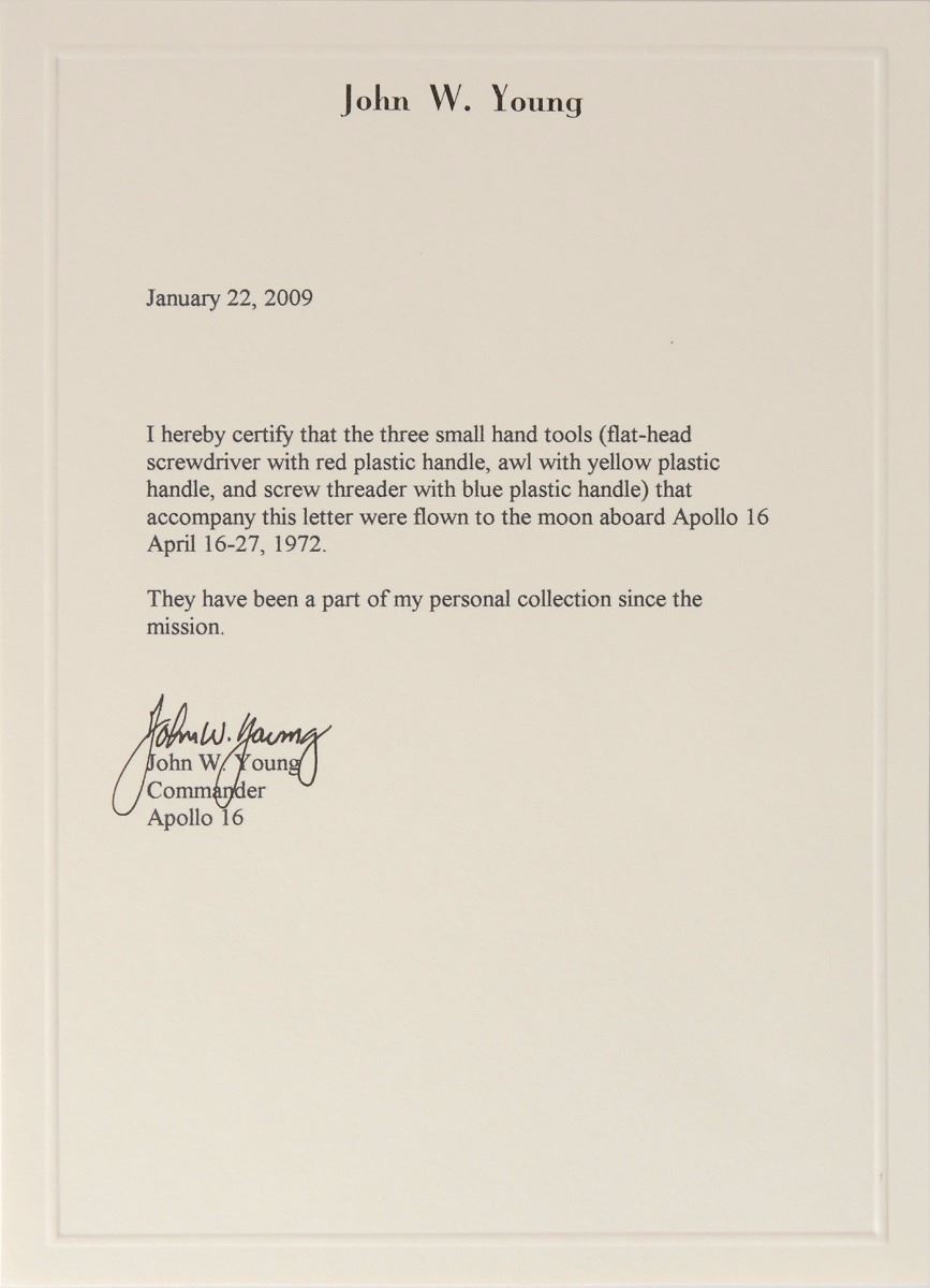Unique set of flown tools carried aboard the lunar module Orion during the Apollo 16 mission. The tools include: a flathead screwdriver with red plastic handle, an awl with yellow plastic handle, and a screw threader with blue plastic handle; each tool approximately measures 4.25? in length. In overall very good condition, with expected wear from use and some slight rusting to awl. Accompanied by a signed letter of certification from Apollo 16 Commander John Young, dated January 22, 2009, in part: “I hereby certify that the three small hand tools…that accompany this letter were flown to the moon aboard Apollo 16 April 16–27, 1972. They have been a part of my personal collection since the mission.” Also accompanied by a photo of an Apollo/Saturn equipment sheet, dated August 6, 1971, listing hand tools as among the items Young carried aboard the spacecraft. Ever cognizant of the potentially wide array of problems and repairs posed aboard a moon-departing module, Young personally chose and carried this set of hand tools in the off-chance a quick fix was in order. A scarce flown format with excellent provenance from the mission commander, an astronaut who remains particularly sought-after amongst collectors.
