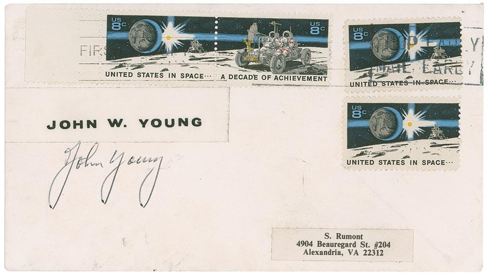 Mailing envelope, 6.5 x 3.75, with several commemorative stamps affixed along top, signed in black ballpoint by Young. Scattered soiling, some mild rippling, and an address label affixed to bottom edge, otherwise fine condition.