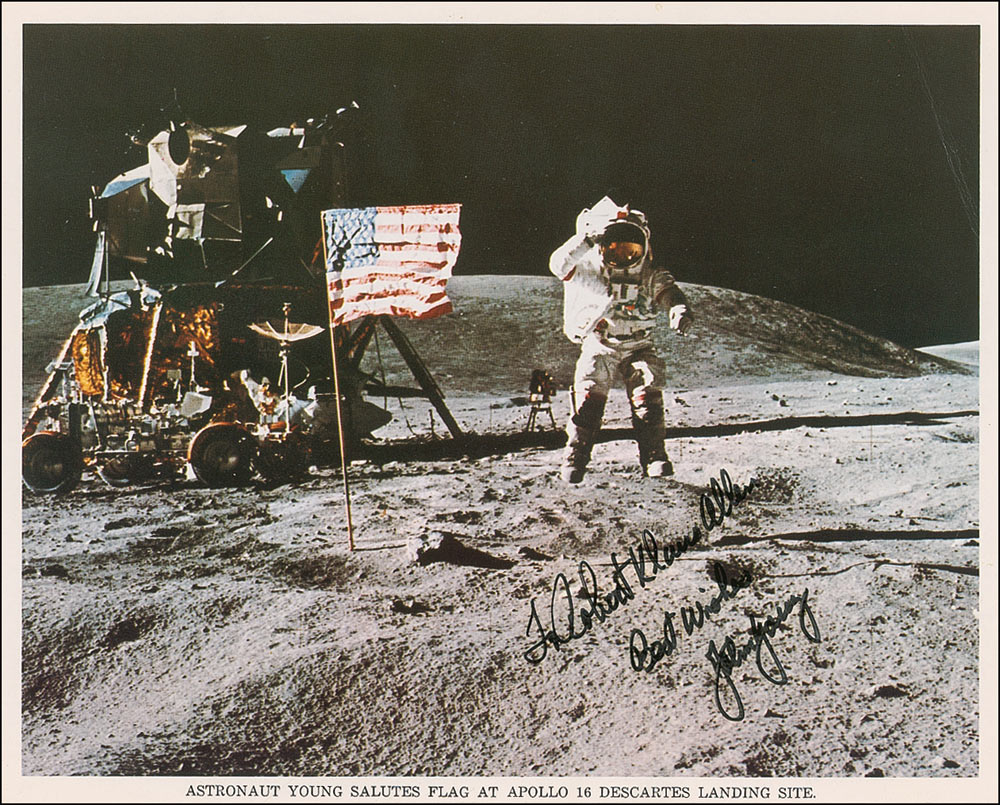 Color 10 x 8 NASA photo of Young saluting the American flag while on the lunar surface, signed and inscribed in black felt tip “To Robert Klaus Allen, Best wishes, John Young.” In fine condition, with a crease to top right corner.