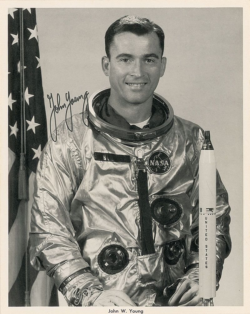 Nice 8 x 10 NASA photo of Young posing in his Gemini flight suit with a model rocket, signed in black felt tip. In fine condition.