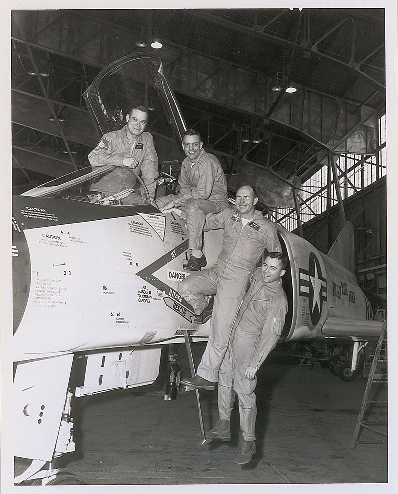 Extremely rare unsigned original 1962 glossy 8 x 10 photo of John Young posing with a Navy fighter jet with Lt. Colonel William McGraw, Cdr. Dave Longton, and Cdr. Del Nordberg. A copy of the photo’s caption is printed on the reverse, with “Released,” stamped in the lower corner. In fine condition. From the Leslie Cantwell collection.