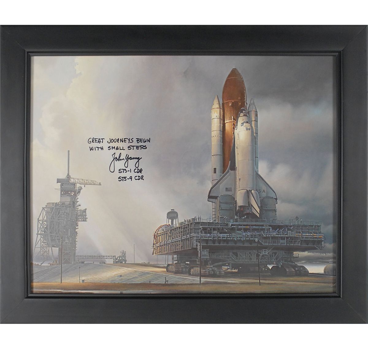 Color 17.5 x 13.75 print of an artist’s rendition of the Space Shuttle being taken to the launch pad, signed in black felt tip, “Great journeys begin with small steps, John Young, STS-1 CDR, STS-9 CDR.” Framed to an overall size of 21 x 17. In fine condition.