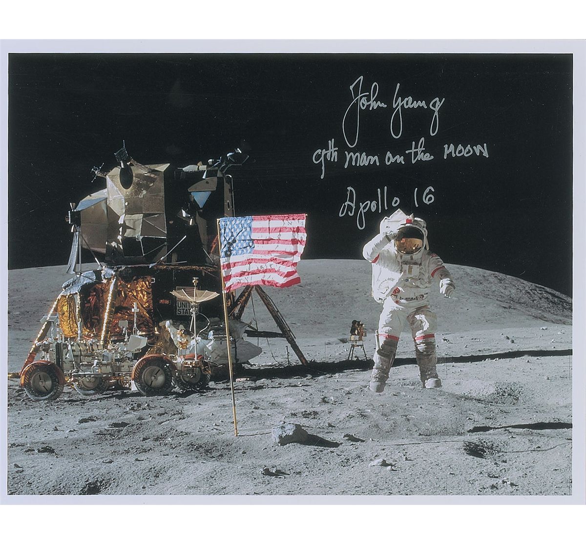 Color satin-finish 10 x 8 photo of Young on the moon with the Lunar Module and American flag, signed in silver ink, “John Young, 9th Man on the Moon, Apollo 16.” In very fine condition.