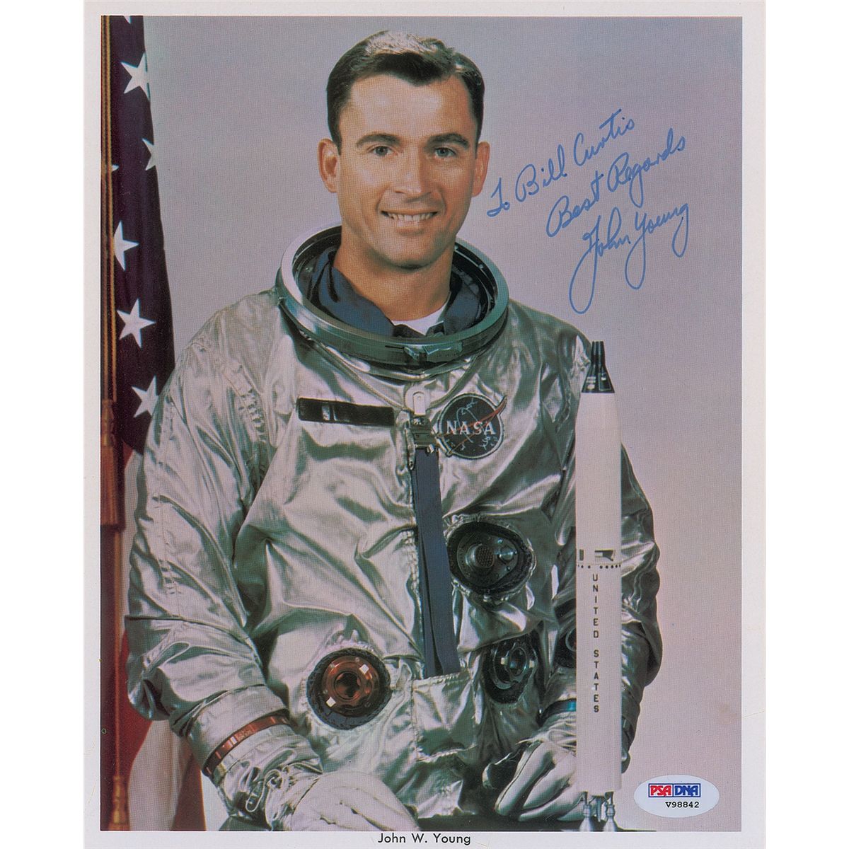 Official color 8 x 10 NASA lithograph of Young in his Gemini space suit, signed and inscribed in blue felt tip, “To Bill Curtis, Best Regards, John Young.” In fine condition, with a PSA/DNA label affixed to the lower right corner. Accompanied by a certificate of authenticity from PSA/DNA.