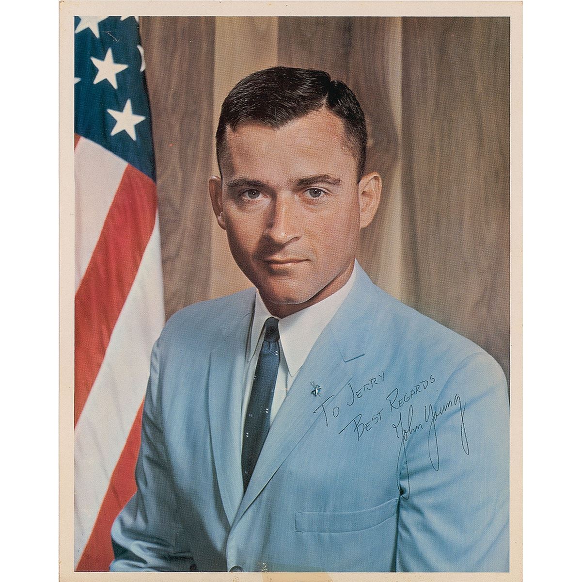 Handsome color 8 x 10 cardstock photo of Young in a suit and tie, signed and inscribed in black ballpoint, “To Jerry, Best Regards, John Young.” In fine condition, with trivial edgewear, and a spot of scuffing and irregular toning to lower border from a removed piece of tape.