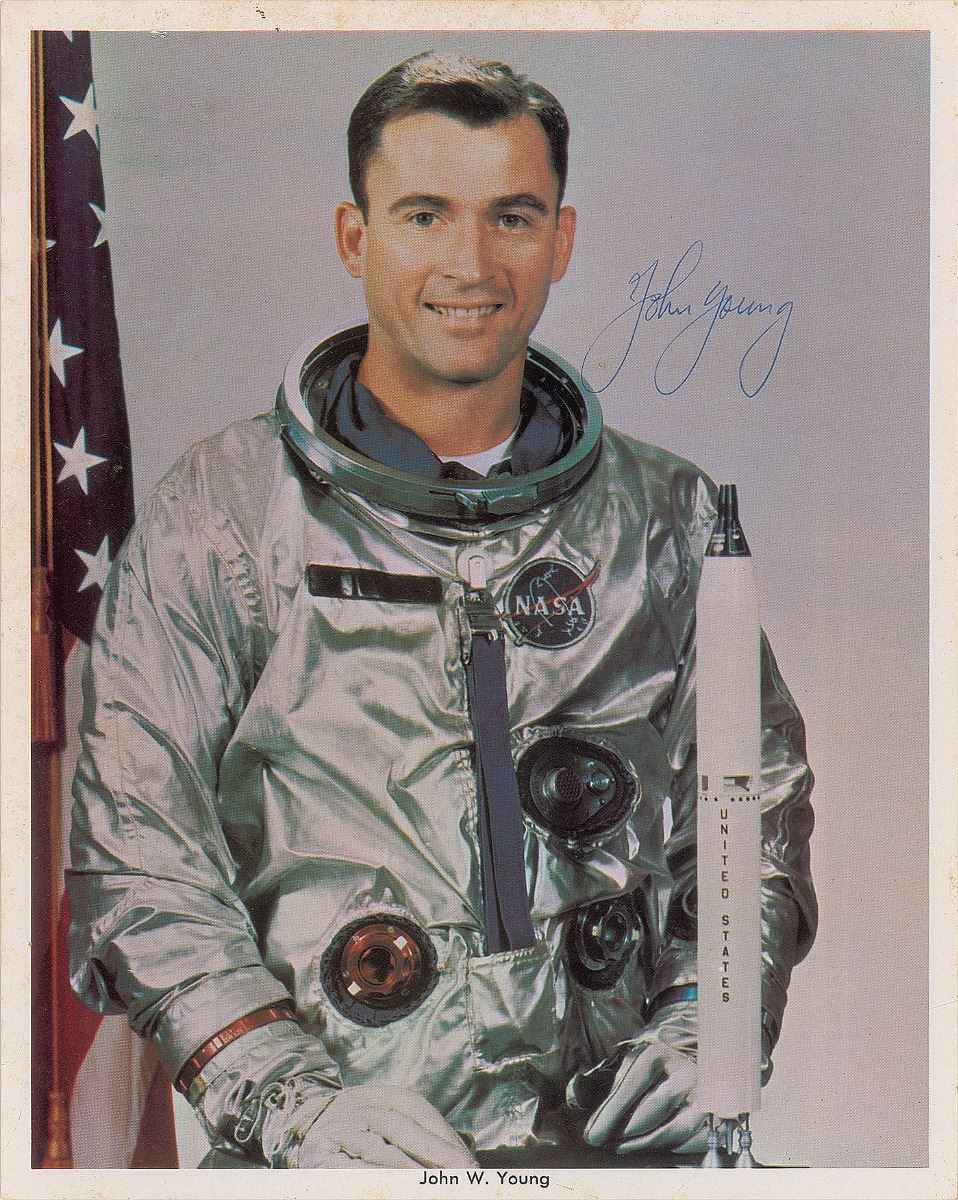Appealing official color 8 x 10 NASA lithograph of John Young posing in his silver Gemini space suit, signed in blue ballpoint. In very good to fine condition, with scattered light foxing and surface impressions. Accompanied by a full letter of authenticity from Zarelli Space Authentication.