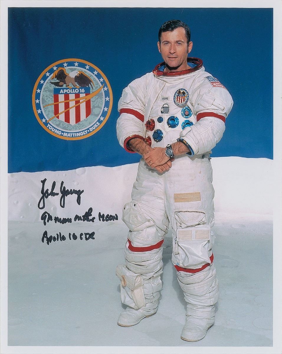 Desirable color satin-finish 8 x 10 full-length photo of Young posing in his white space suit, signed in black felt tip, “John Young, 9th man on the moon, Apollo 16 CDR.” In very fine condition.