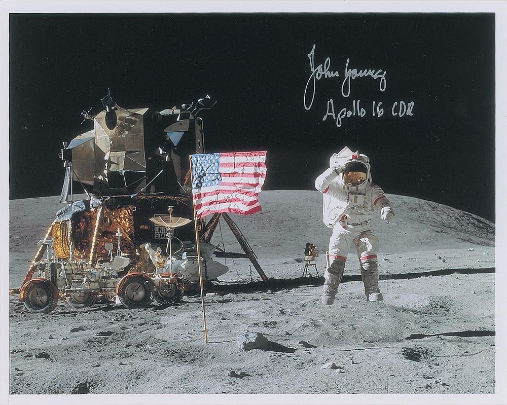 Color satin-finish 10 x 8 full-length photo of Young jumping off the lunar surface and saluting the American flag, neatly signed in silver ink, “John Young, Apollo 16 CDR.” In very fine condition.