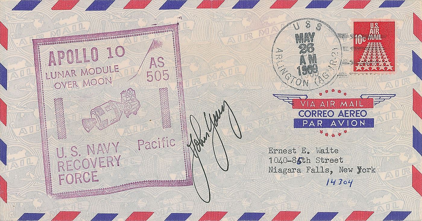 Recovery cover with a stamped cachet honoring the Apollo 10 US Navy Pacific Recovery Force, postmarked May 26, 1969, USS Arlington, signed in black ink by Young. In fine condition, with a central vertical fold.