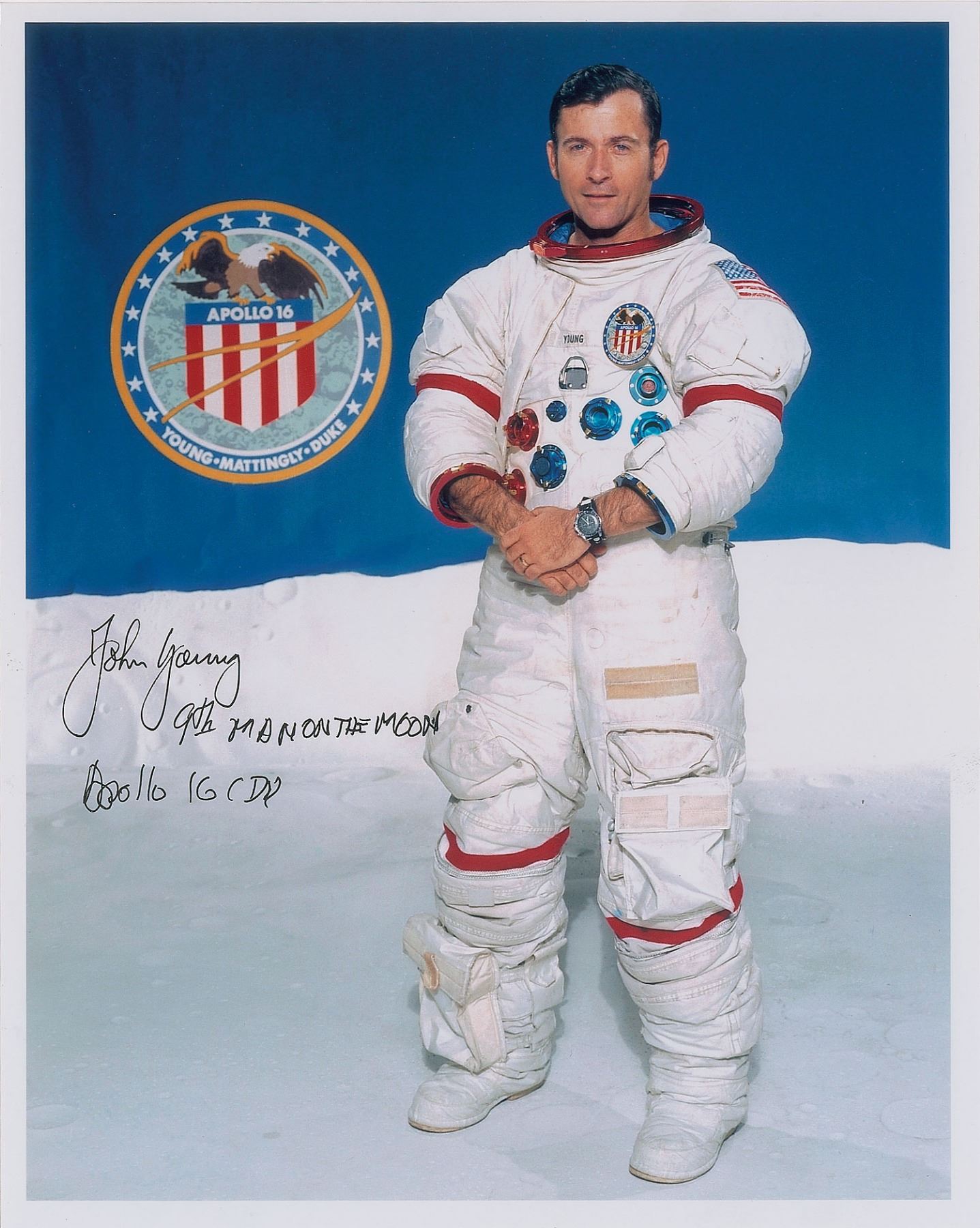 Sought-after color satin-finish 8 x 10 full-length photo of Young posing in his white space suit with an Apollo 16 mission insignia in the background, signed in thin black felt tip, “John Young, 9th man on the moon, Apollo 16.” In very fine condition. Young remains among the most desirable astronauts in signed photos, with this ideal example augmented by his clean handwriting and the mention of his lunar fraternity.