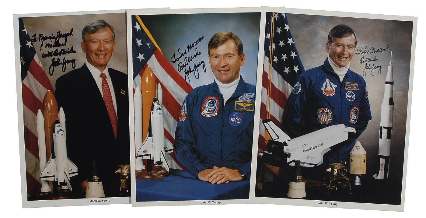 Three different color 8 x 10 NASA photos of Young posing in his flight suit and civilian clothes, each signed and inscribed in black felt tip by Young. In very fine condition. Pre-certified Scott Cornish and RRAuction COA.