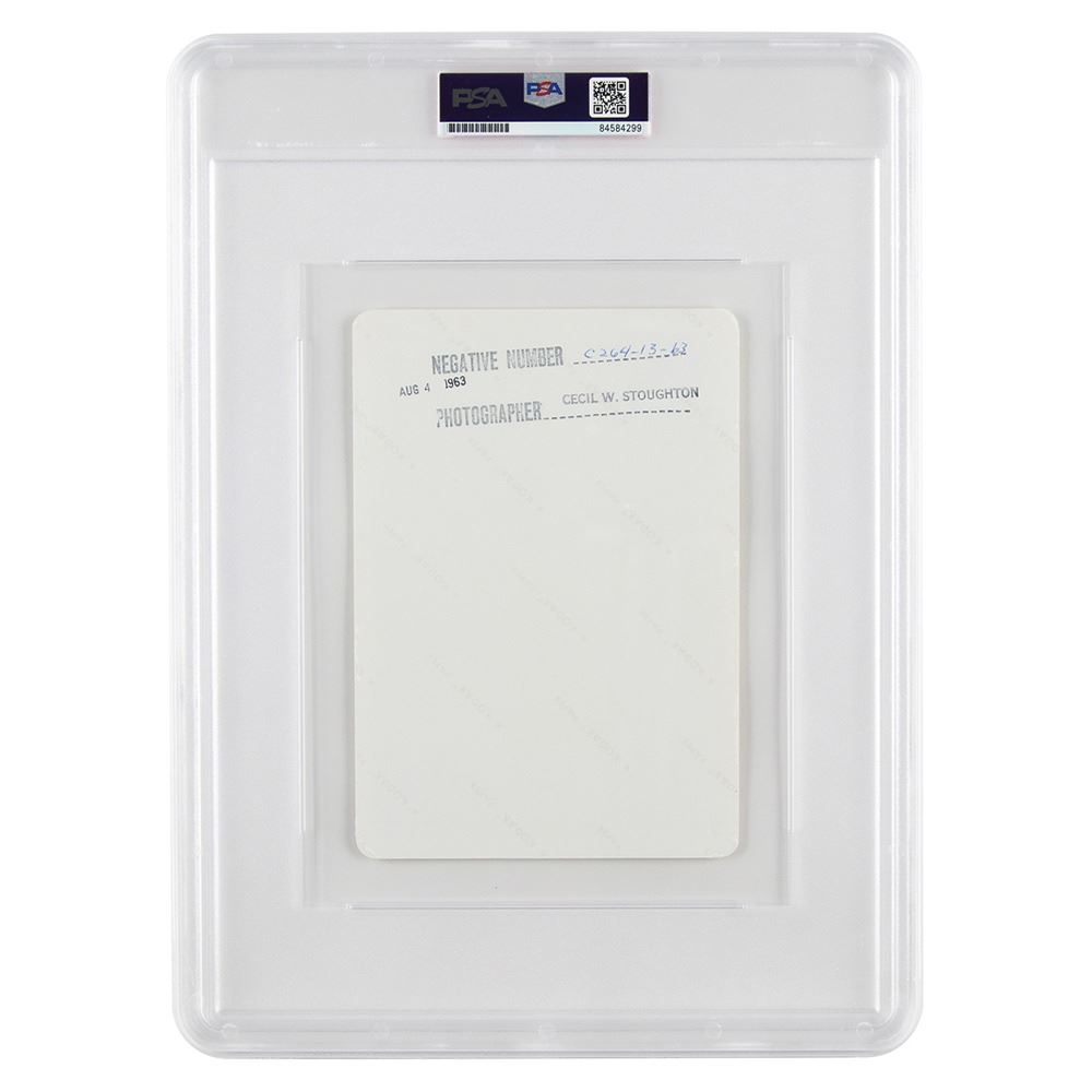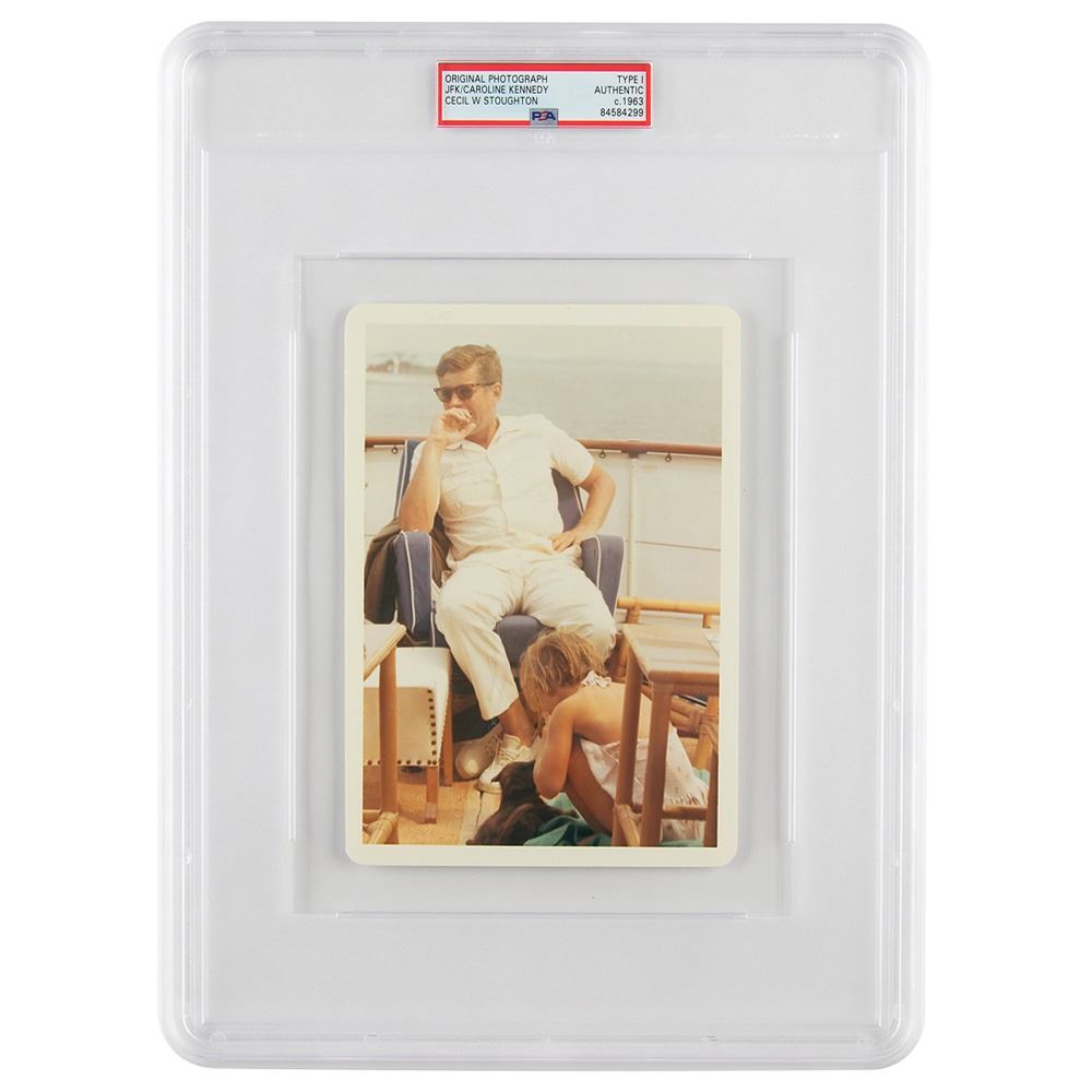 Original vintage color glossy 5 x 7 photo of President John F. Kennedy and his young daughter Caroline aboard the Honey Fitz yacht off of Hyannisport on August 4, 1963, taken by official White House photographer Cecil W. Stoughton. The reverse is stamp-dated August 4, 1963, bears & ldquo;A Kodak Paper& rdquo; watermarks, and is annotated with the negative number, & ldquo;C264-13-63,& rdquo; above his photographer credit stamp. In fine condition. Encapsulated by PSA as an authentic & #39;Type I& #39; photograph.
