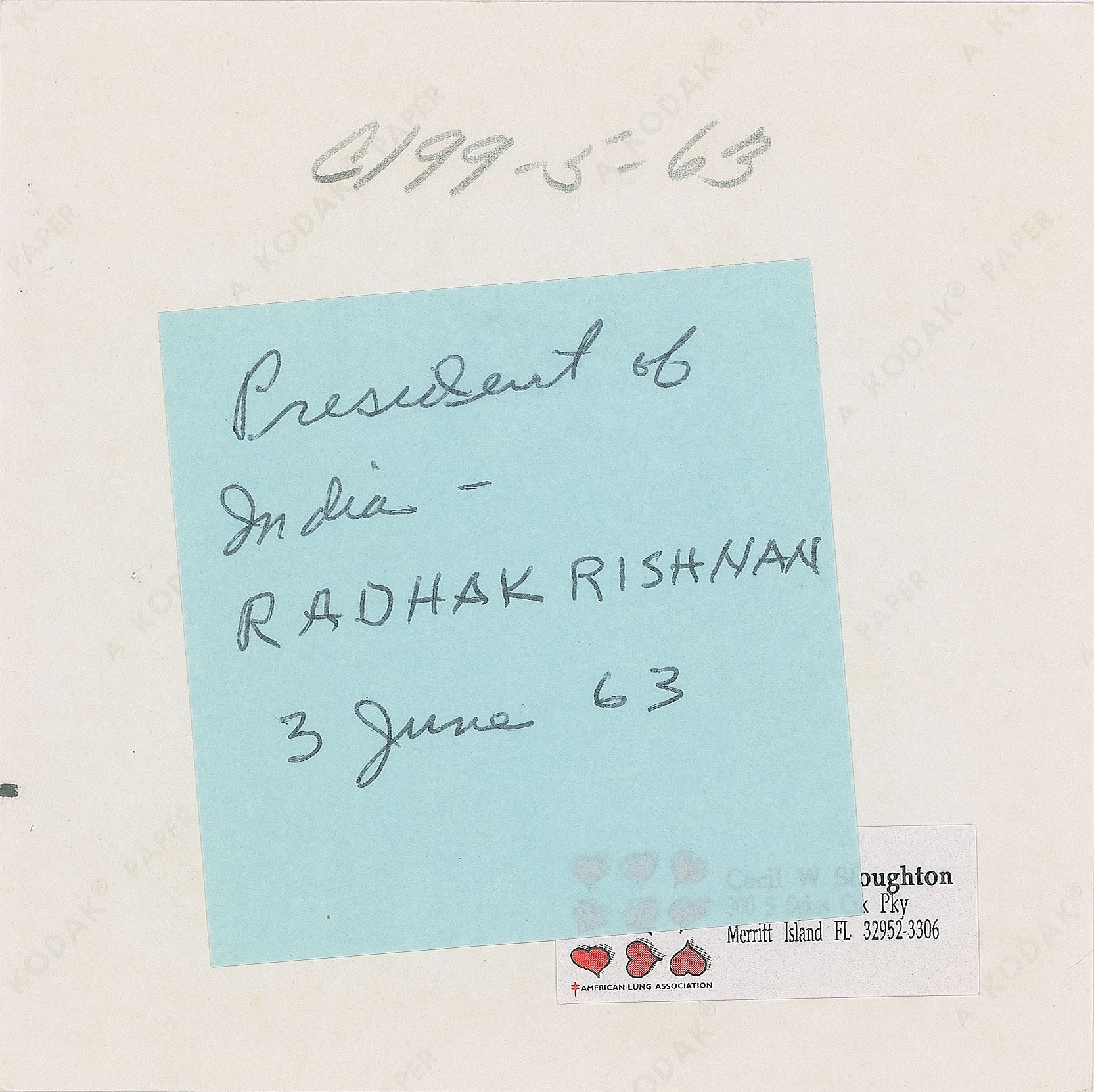 Cecil Stoughton's own original vintage color glossy 5 x 5 photo photo of President John F. Kennedy and First Lady Jacqueline Kennedy offering parting words to Indian president Dr. Sarvepalli Radhakrishnan following a state dinner at the White House on June 3, 1963, taken by official White House photographer Cecil W. Stoughton. Reverse bears "A Kodak Paper" watermarks, Stoughton's affixed address label, and a pencil notation, "C199-5-63." In fine condition. From the collection of Cecil W. Stoughton.