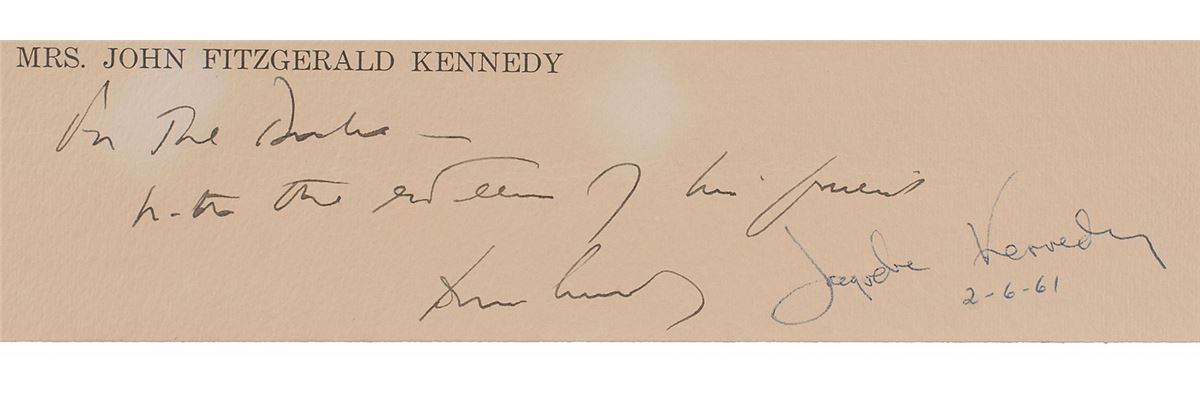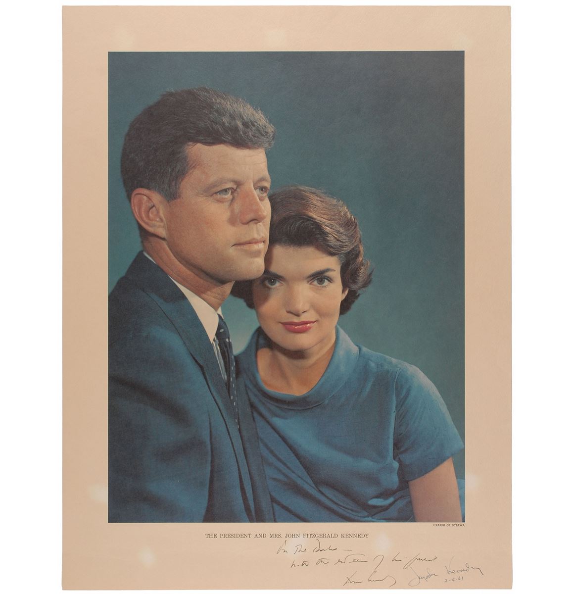 Stunning color 17 x 22 Yousuf Karsh photographic portrait print of John and Jacqueline Kennedy, captioned “The President and Mrs. John Fitzgerald Kennedy,” signed and inscribed in the lower border in black ink, “For the Duke, with the esteem of his friend, John F. Kennedy,” and in blue ballpoint, “Jacqueline Kennedy, 2–6–61.” Printed text in the lower right border credits the photo to Ottawa of Karsh. In fine condition, with minor spots of discoloration to the borders from old tape remnants on the reverse.