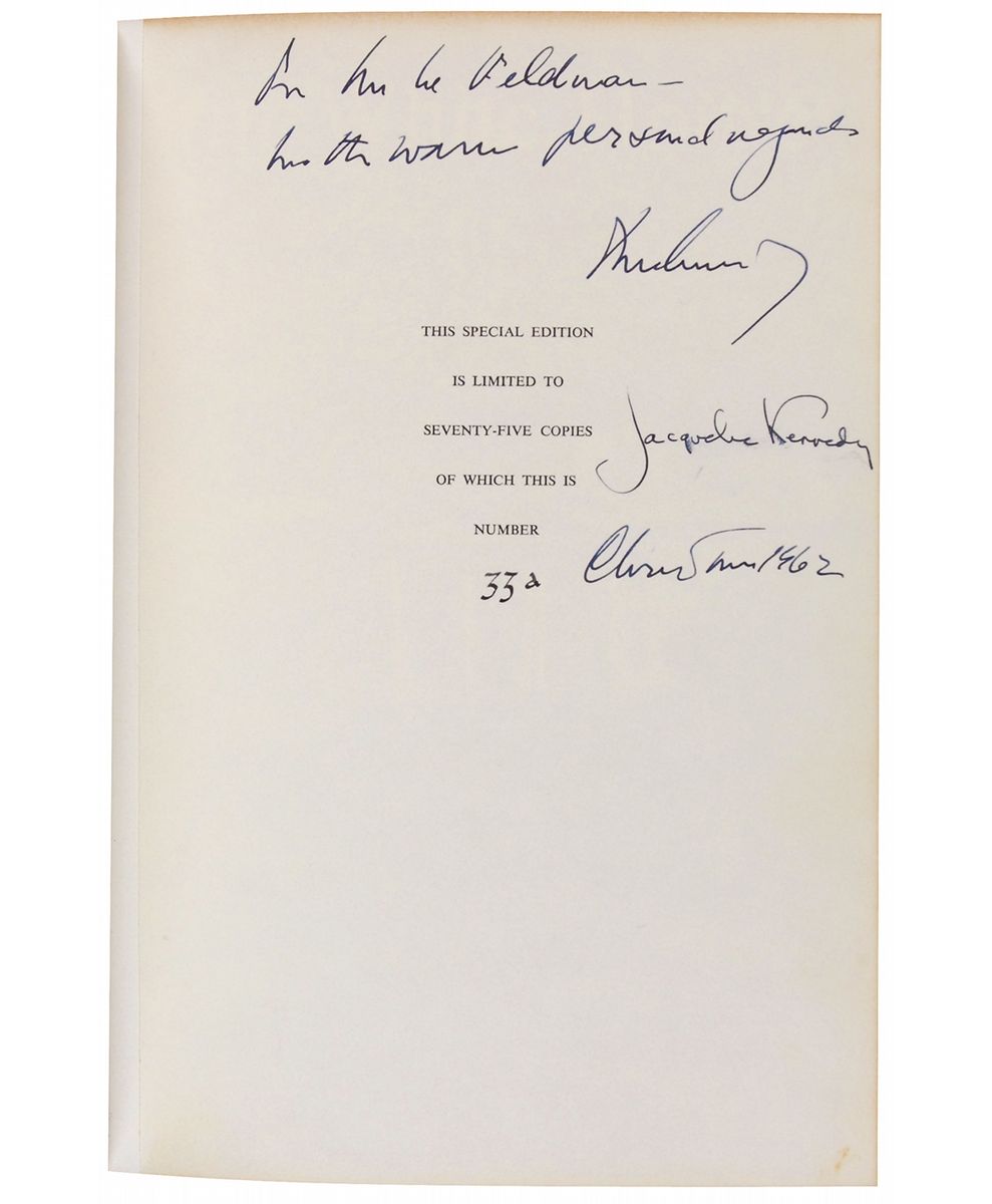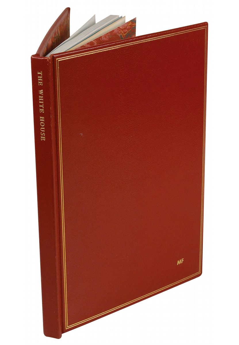 Signed book: The White House. Special limited edition of 75 copies (this being No. 33a). Washington, DC: White House Historical Association, 1962. Red leather hardcover with "MF" at bottom right, 7.25 x 10.25, 130 pages. Signed and inscribed on the colophon, “For Mike Feldman, with warm personal regards, John F. Kennedy,” and “Jacqueline Kennedy,” with John adding, “Christmas 1962,” under his wife’s signature. Autographic condition: fine, with a couple of light brushes to Jacqueline’s signature. Book condition: VG+/None. Red leather-covered boards with gilt title and beautiful marbled endpapers; few minor scuffs to covers, otherwise NF condition.