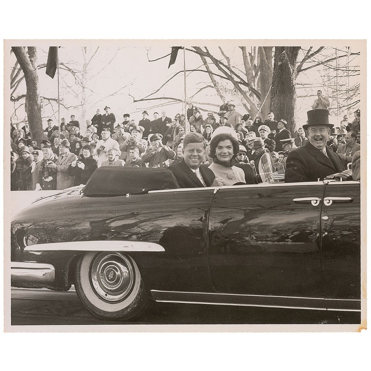 Original vintage glossy 10 x 8 photo of John and Jacqueline Kennedy riding in a convertible during the inaugural parade on January 20, 1961. In fine condition. Accompanied by a letter of provenance from the daughter of Kennedy’s friend and governor of Rhode Island, John A. Notte, Jr., in part: “This picture of the Kennedys on inauguration day, January 20, 1961, is one of a kind. I along with my family went to Washington D.C. for the inauguration…My father, at his own expense, took along his personal state photographer…We had front row seats along the parade route…This picture has never been published—it has always been in my family.” An outstanding image that perfectly captures exuberance of the day.