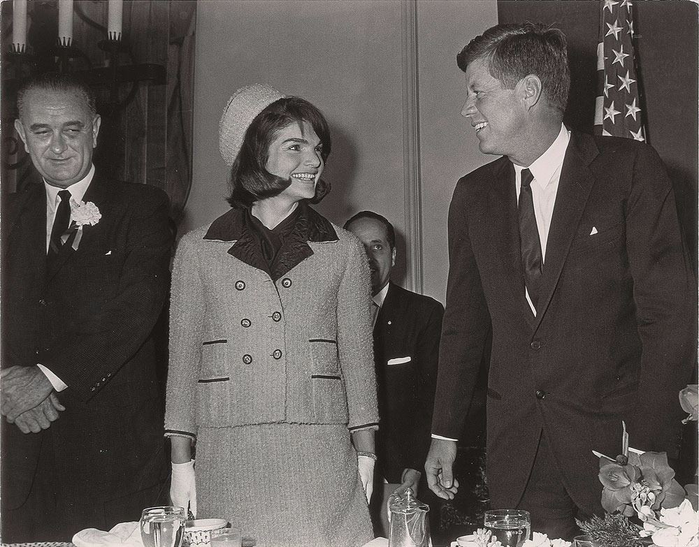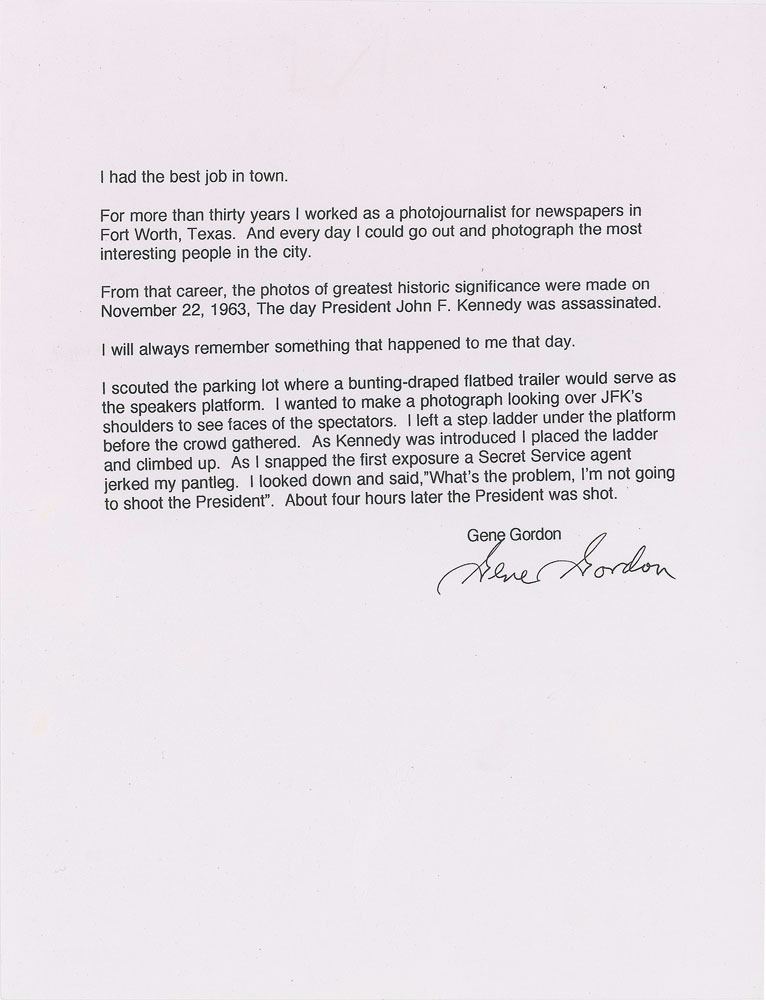 Original semi-glossy 14 x 11 photo of JFK at a reception with the first lady and vice president in Fort Worth during his fateful Texas trip, taken by photojournalist Gene Gordon. In fine condition. Accompanied by a copy of a letter by Gordon recollecting the events of the day Kennedy was assassinated. A desirable example as these photos are generally reproductions rather than originals.