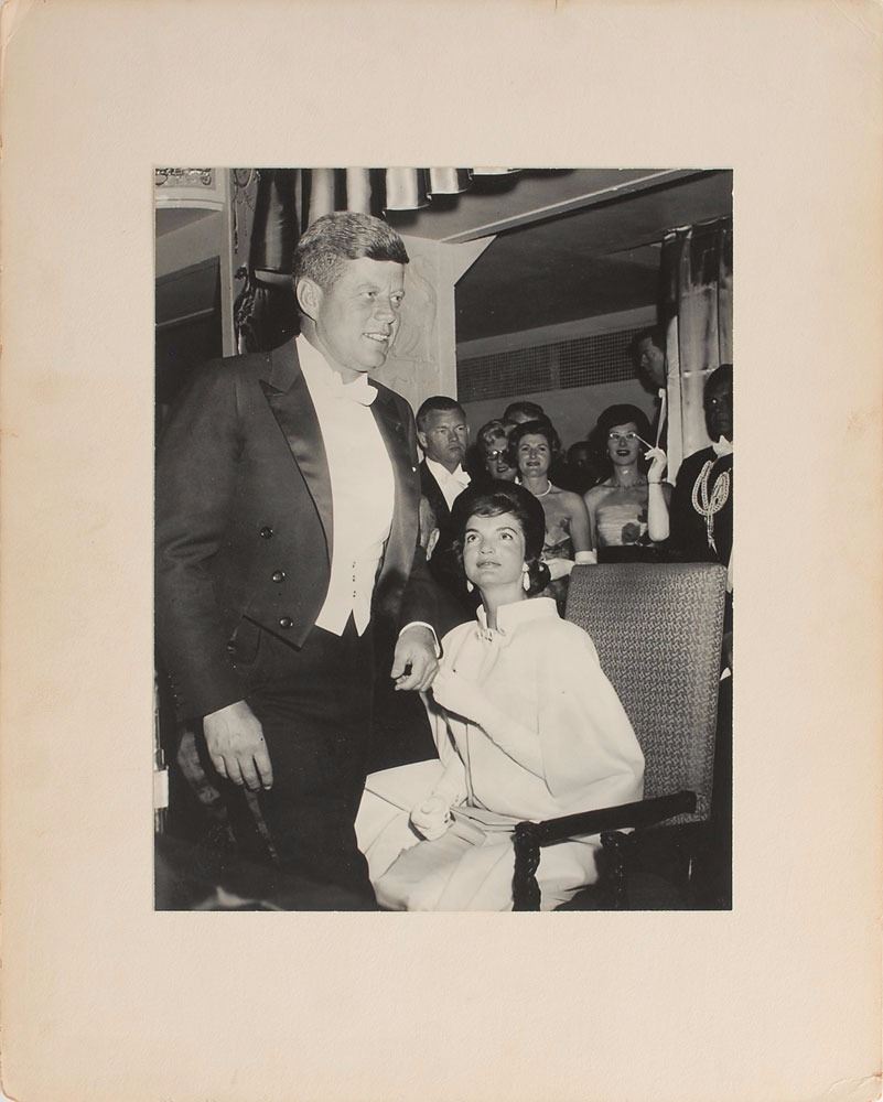 Original matte-finish 10.5 x 13.5 photo of John F. Kennedy and Jacqueline Kennedy at a formal gala in 1961, affixed to its original mount. In fine condition.