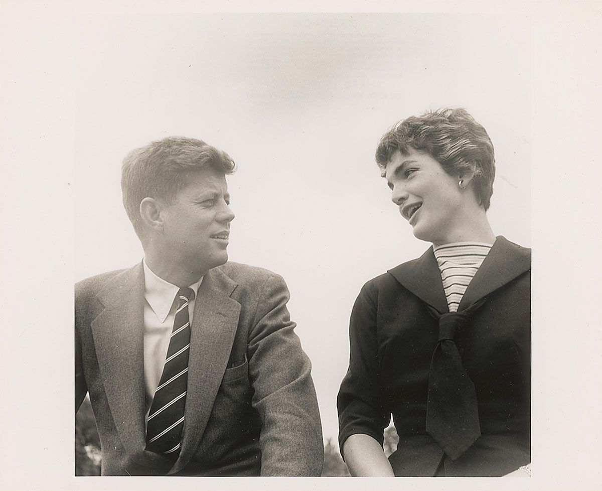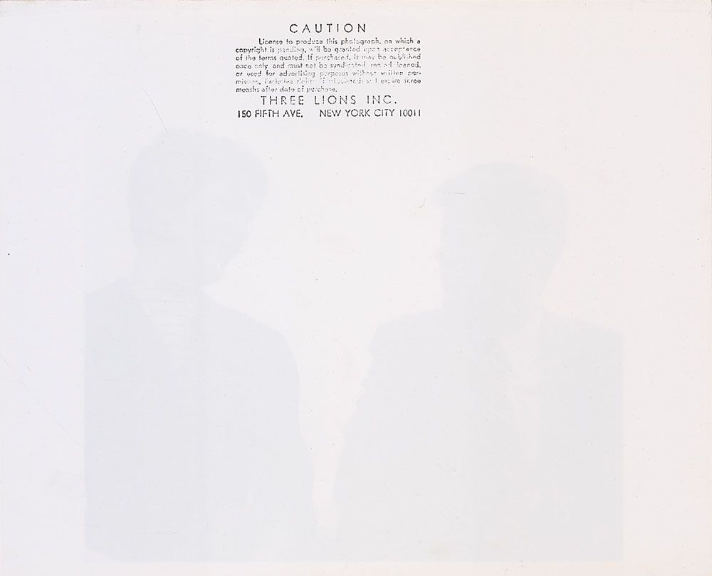 Original first-generation glossy 10 x 8 photo of the couple happily talking to each other on a nice day. Reverse of photo bears a Three Lions Inc. stamp. In fine condition.