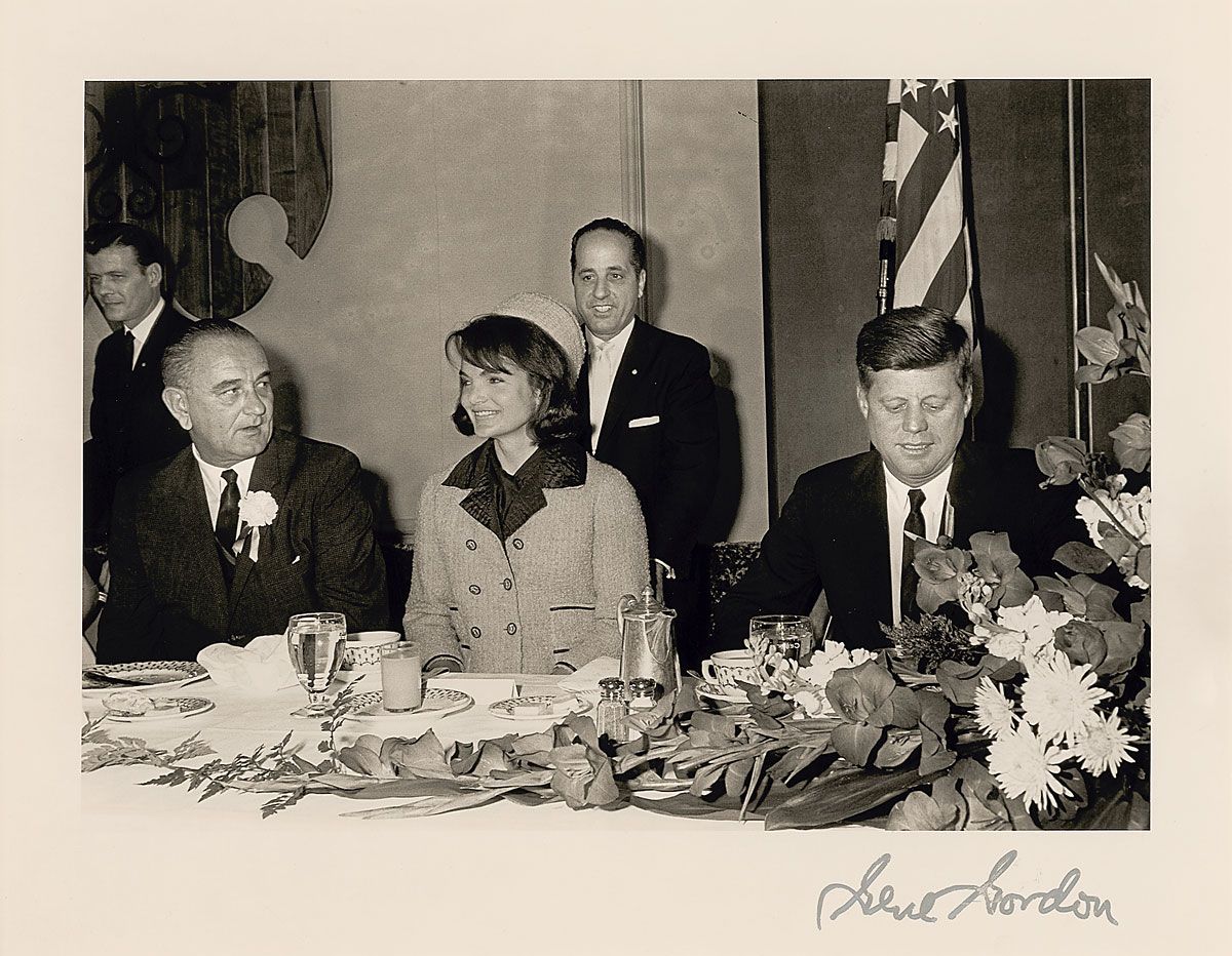 Semi-glossy 14 x 11 photo of JFK dining with the first lady and vice president in Fort Worth, signed in the lower right in silver ink by the photographer, Gene Gordon. In fine condition, with a brush to the first letter of Gordon’s last name.