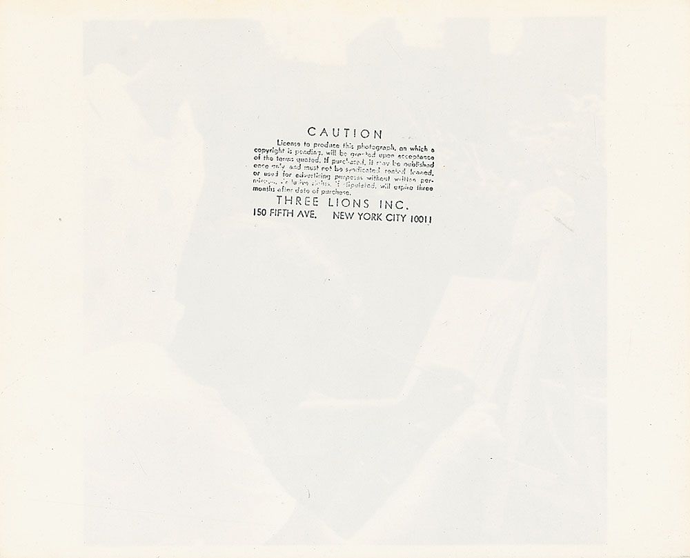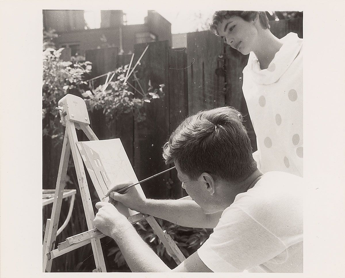 Original first-generation 10 x 8 glossy photo of John Kennedy painting in his yard as Jackie looks over his shoulder. Reverse of photo bears a Three Lions Inc. stamp. In fine condition. In an attempt to share her artistic love, Jackie gave her husband a set of oil paints—and a biography of Churchill, to show that even ‘manly’ men could paint—for their first Christmas together. While his skill was minimal, John enjoyed painting during these early days together at Dent Place, and again picked up his brushes the following year while recuperating from his surgery. After his recovery, his political career consumed his full attention and his hobby came to an end; Suero’s photos are the only known images of Kennedy painting.