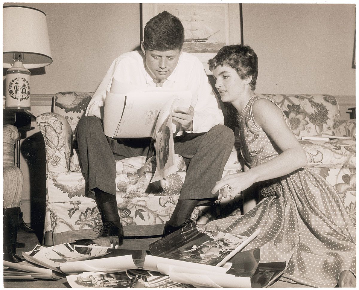Original first-generation 9.75 x 8 glossy photo of John and Jackie Kennedy happily rifling through a spilled box of wedding photos. Reverse of photo bears a Three Lions Inc. stamp. In fine condition. According to photographer Orlando Suero, the couple knocked over this box of photos while searching for one in particular (most likely for an upcoming publication). With Bobby and Ethel visiting—he the best man, and she a bridesmaid—the four ‘spent a happy half hour looking at the photos and reminiscing about the wedding.’ Published in Camelot at Dawn, Johns Hopkins University Press, 2001.