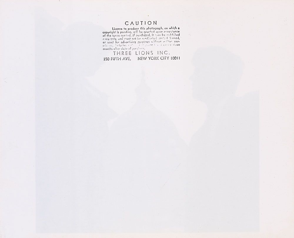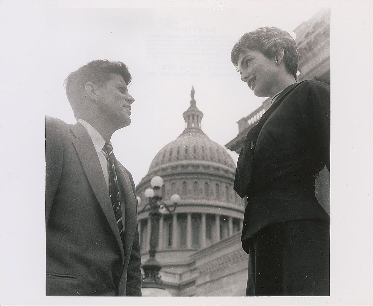 Gorgeous original first-generation glossy 10 x 8 photo of John and Jackie with the Capitol in the background, both looking handsome and powerful. Reverse of photo bears a Three Lions Inc. stamp. In fine condition, with a small crease to the top edge.