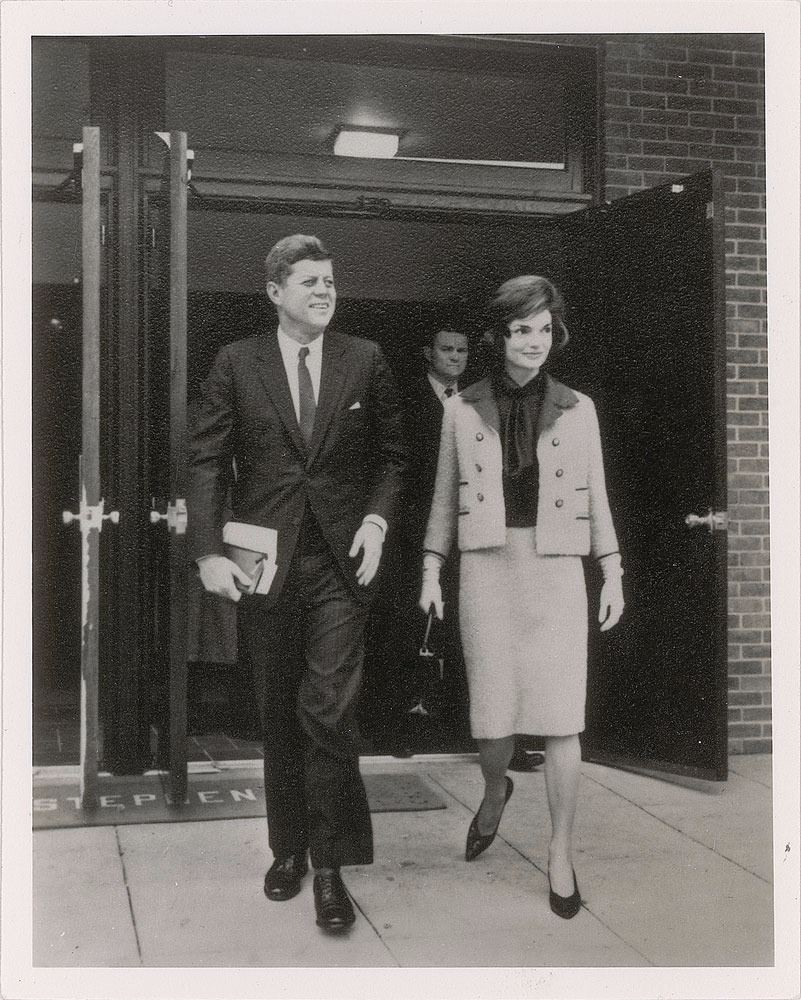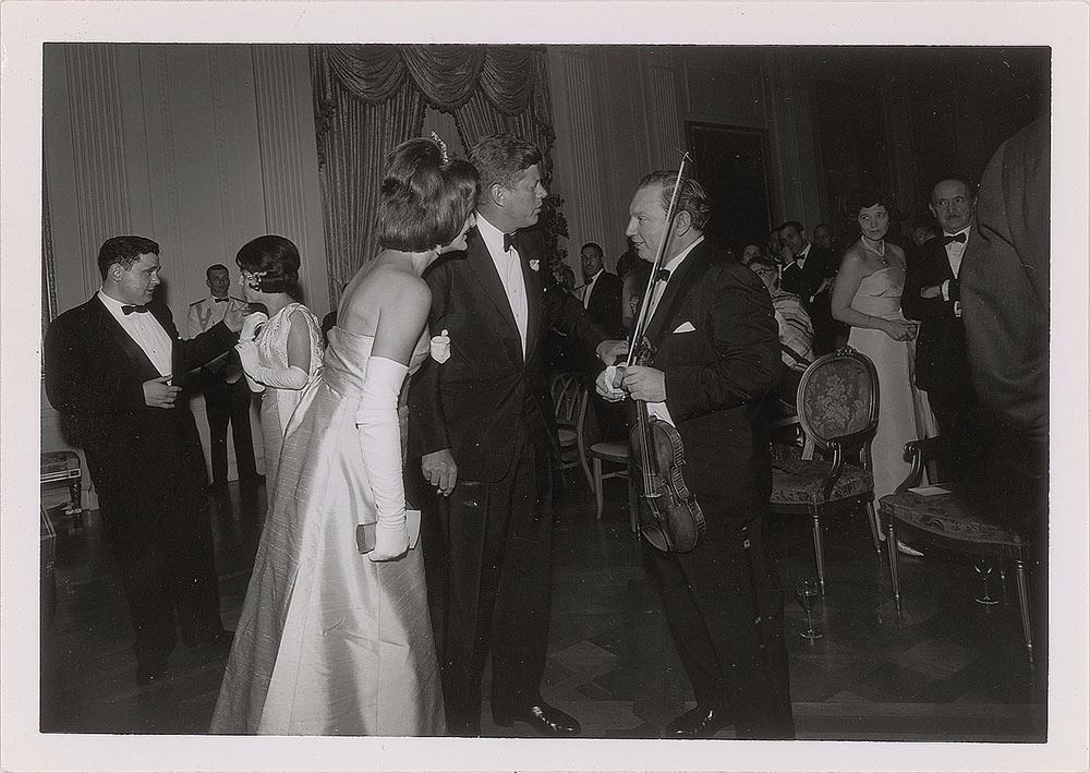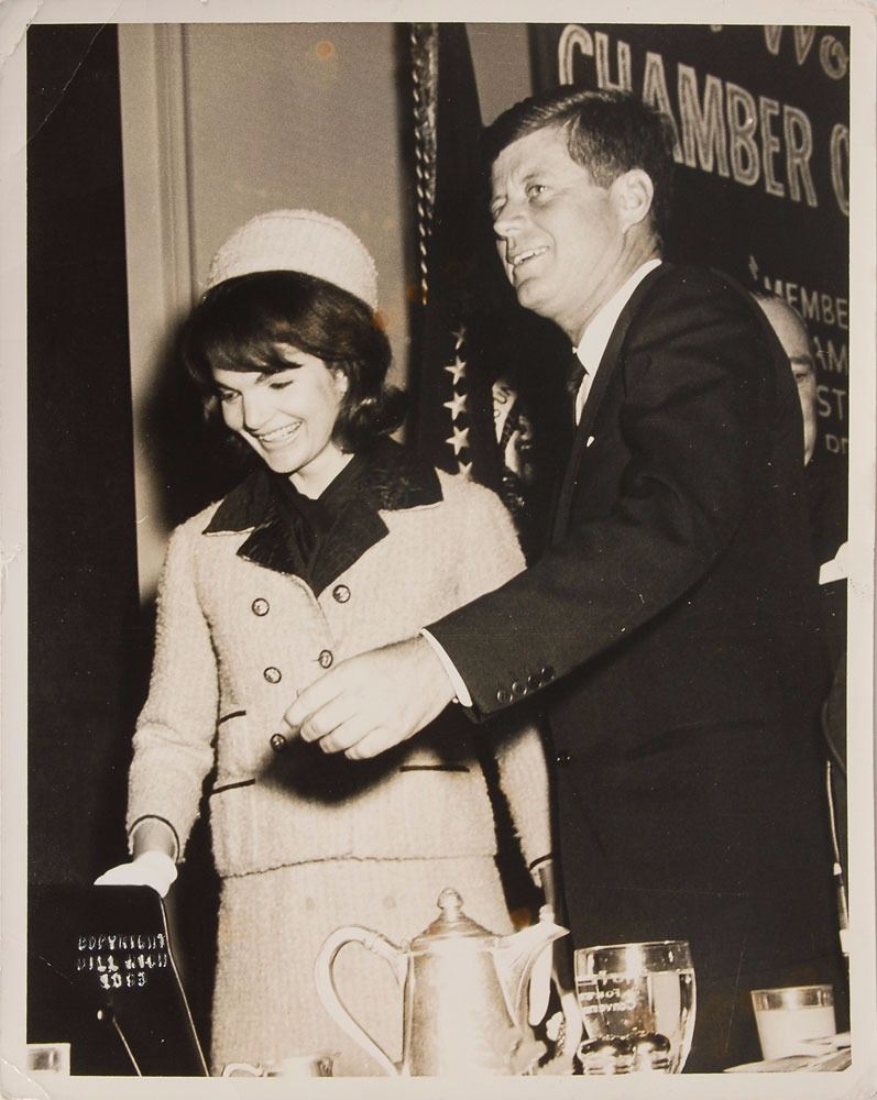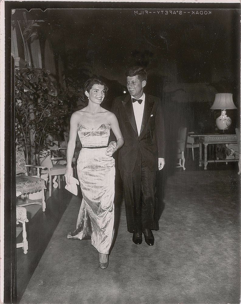 Collection of photographs of John F. Kennedy and Jacqueline Kennedy, including: an original matte-finish 9.25 x 11.5 silver gelatin portrait of the Kennedys by Mark Shaw, bearing a 1964 Mark Shaw copyright stamp on the reverse; an original matte-finish 8 x 10 silver gelatin photo of John and Jacqueline Kennedy at the Fort Worth Chamber of Commerce breakfast on the morning of November 22, 1963, blindstamped in the lower left, "Copyright Bill Rich, 1963,” with a Bill Rich credit stamp on the reverse; two color 2.5 x 2.5 transparencies showing Jacqueline Kennedy; a glossy 4 x 5 contract print of a Kodak safety negative showing the Kennedys together at a formal event at the Everglades Club in 1956, stamp-dated as used in 1987 on the reverse; two glossy 7 x 5 silver gelatin photos of the Kennedys and violinist Isaac Stern in 1962, bearing Cecil Stoughton credit stamps on the reverse; and a vintage matte-finish 4 x 5 White House response photograph of the Kennedys together, with Jacqueline in the outfit she was wearing in Dallas, made on a government photo processor in 1963. In overall very good to fine condition, with a fleck of surface loss to the Shaw portrait and some creasing and spots of discoloration to the Fort Worth photo.