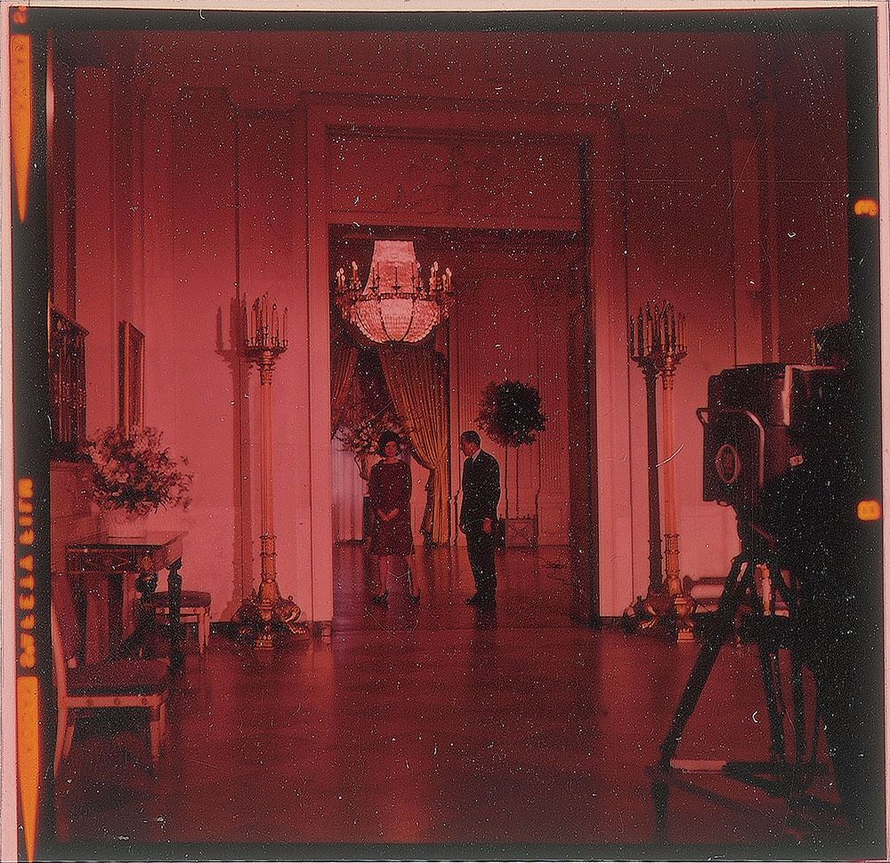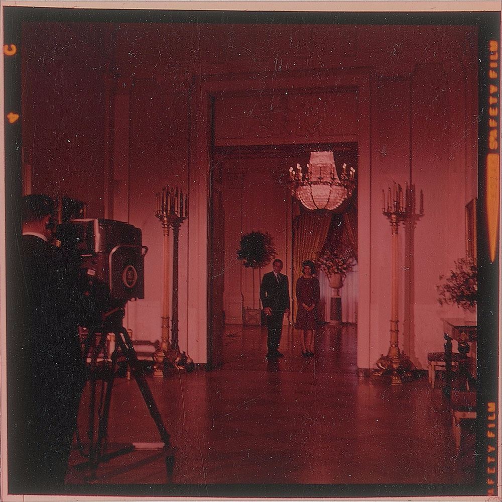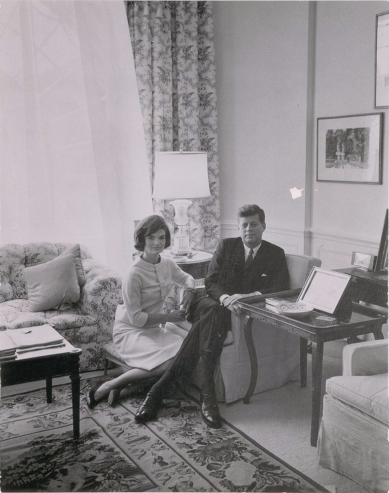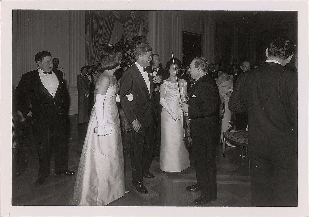 Collection of photographs of John F. Kennedy and Jacqueline Kennedy, including: an original matte-finish 9.25 x 11.5 silver gelatin portrait of the Kennedys by Mark Shaw, bearing a 1964 Mark Shaw copyright stamp on the reverse; an original matte-finish 8 x 10 silver gelatin photo of John and Jacqueline Kennedy at the Fort Worth Chamber of Commerce breakfast on the morning of November 22, 1963, blindstamped in the lower left, "Copyright Bill Rich, 1963,” with a Bill Rich credit stamp on the reverse; two color 2.5 x 2.5 transparencies showing Jacqueline Kennedy; a glossy 4 x 5 contract print of a Kodak safety negative showing the Kennedys together at a formal event at the Everglades Club in 1956, stamp-dated as used in 1987 on the reverse; two glossy 7 x 5 silver gelatin photos of the Kennedys and violinist Isaac Stern in 1962, bearing Cecil Stoughton credit stamps on the reverse; and a vintage matte-finish 4 x 5 White House response photograph of the Kennedys together, with Jacqueline in the outfit she was wearing in Dallas, made on a government photo processor in 1963. In overall very good to fine condition, with a fleck of surface loss to the Shaw portrait and some creasing and spots of discoloration to the Fort Worth photo.