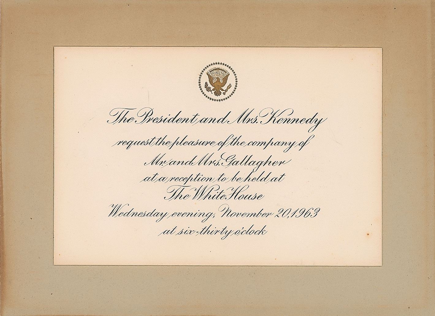 Official 6.25 x 4.25 invitation issued to Mary Barelli Gallagher to attend "a reception to be held at The White House, Wednesday evening, November 20, 1963, at six-thirty o'clock," the last official White House function prior to JFK's fateful trip to Dallas. Affixed to an 8.5 x 6.25 mount. In fine condition. Gallagher was Jacqueline Kennedy's personal secretary.