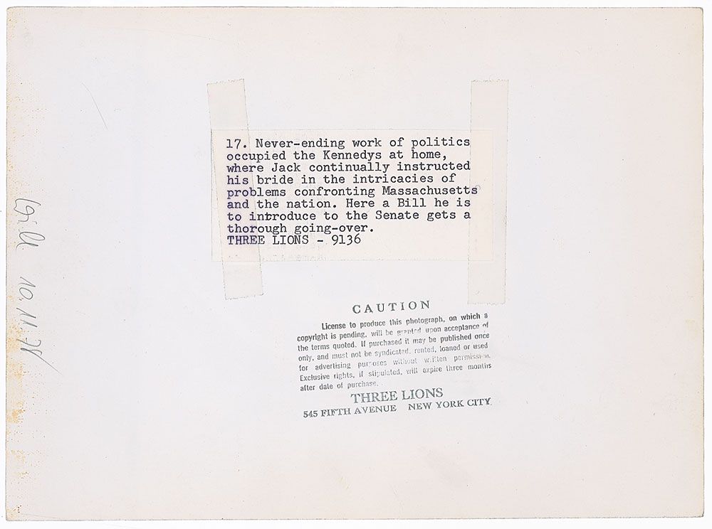 Original first generation 9.5 x 7 glossy photo of John and Jacqueline in their Georgetown home thoroughly going over a Senate bill he will introduce. Reverse of photo bears a Three Lions Inc. stamp and an affixed typed caption, which reads, in part, “Never-ending work of politics occupied the Kennedys at home…Here a Bill he is going to introduce to the Senate gets a thorough going-over.” In fine condition. Photo rights: The Lowenherz Collection of Kennedy Photographs, Friedheim Library and Archives, the Peabody Institute of The Johns Hopkins University, Orlando Suero, photographer.
