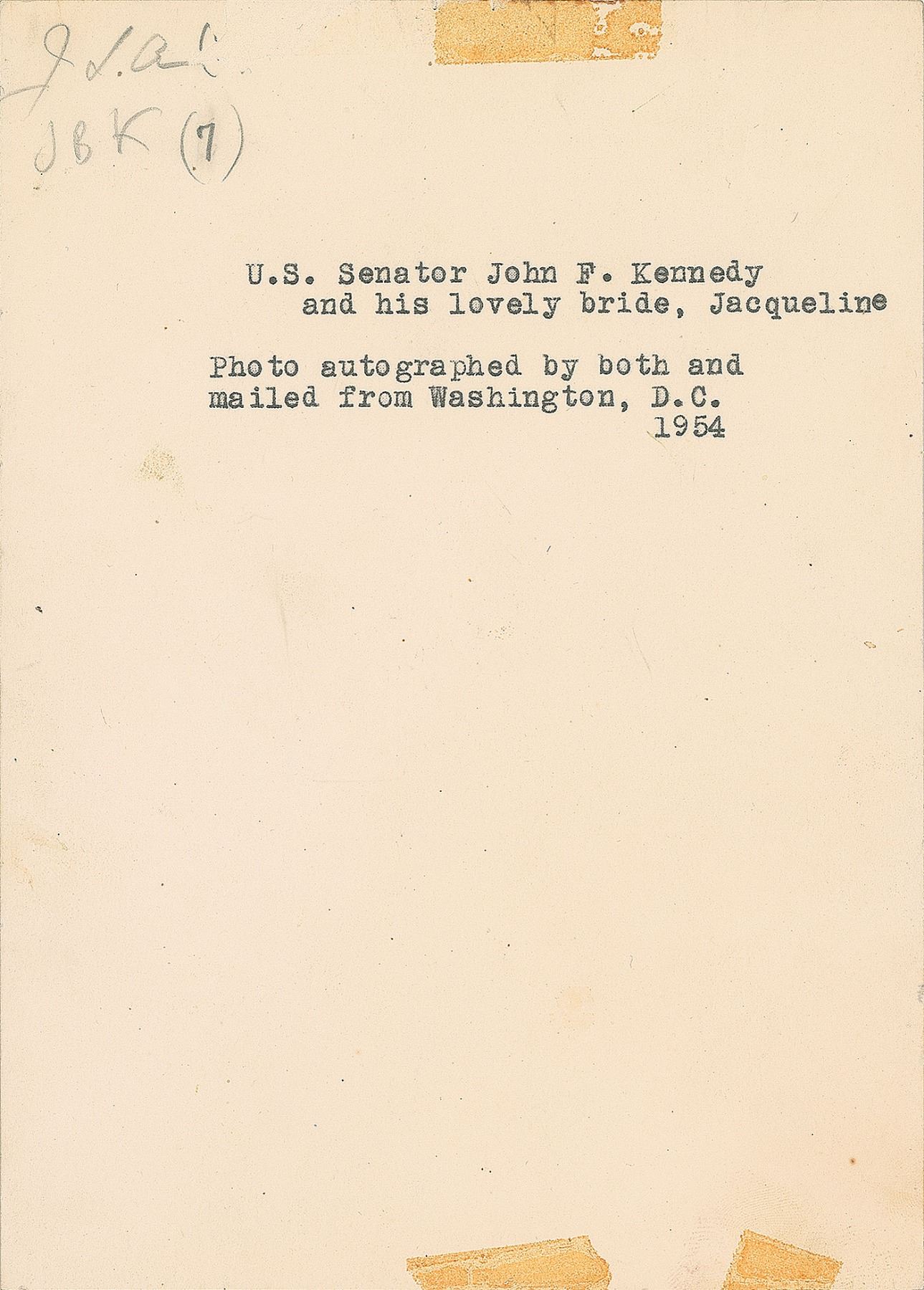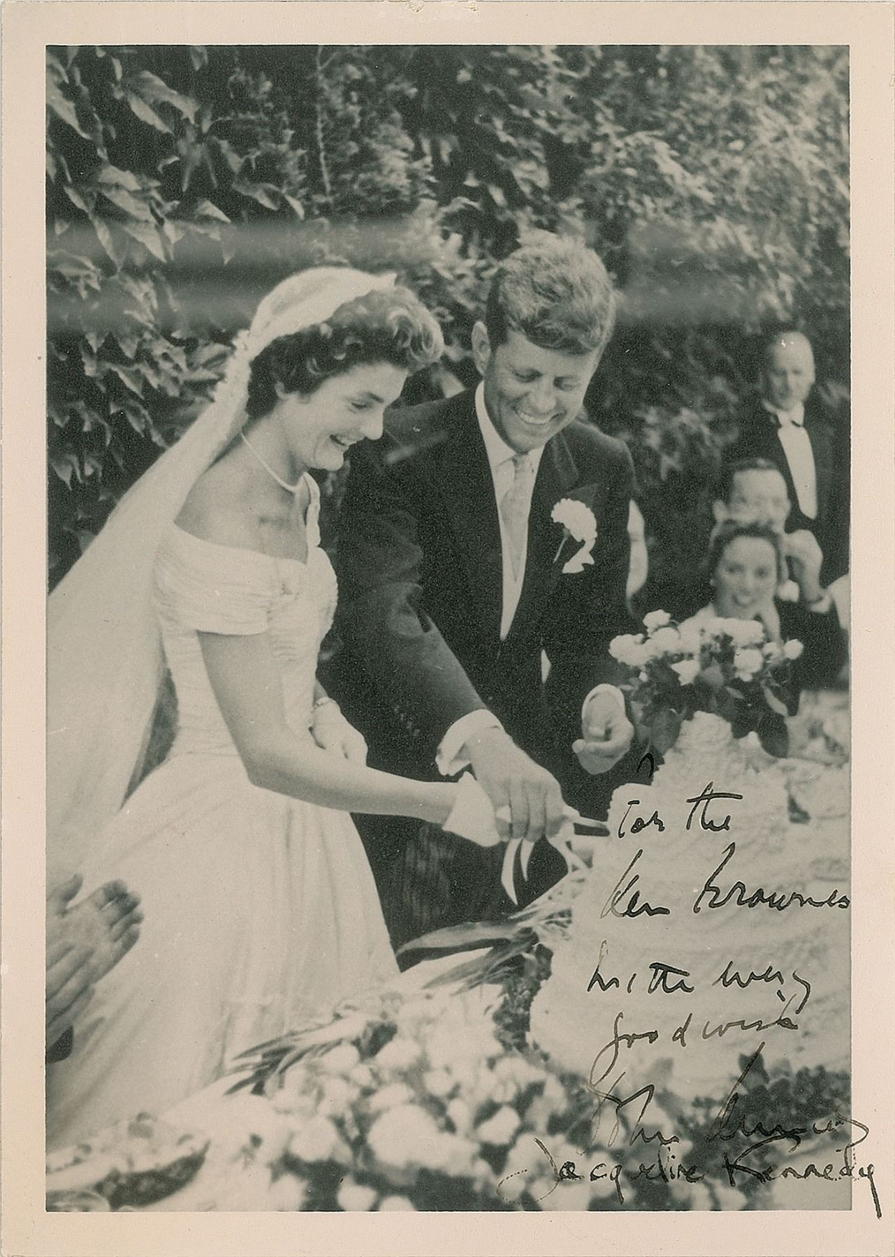 Handsome vintage matte-finish 5 x 7 photo of the Kennedys slicing their wedding cake, signed and inscribed in fountain pen, "For the Ken Brownes, With every good wish, John Kennedy" and "Jacqueline Kennedy.” Reverse bears typed collector's notations indicating that it was signed through the mail in 1954. In fine condition, with two light paperclip impressions to the top edge, and moderate contrast to both signatures against the floral background.