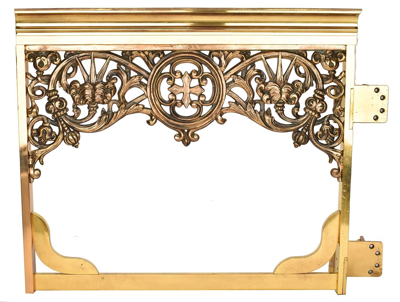 Solid cast bronze altar gate custom-made for the Church of Saint Mary in Newport, Rhode Island, and used in the wedding ceremony of John and Jacqueline Kennedy on September 12, 1953. The heavy bronze gate measures 29.5? x 25.25? x 5?, and features beautiful filigree ornamentation along the top. The frame is flanked by two thick bronze hinges on one side, and has six mounting holes along the rail. In fine condition.