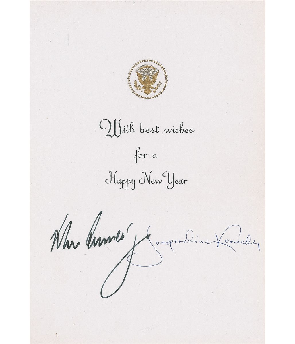 Exceedingly rare official Hallmark card issued during the 1963 holiday season, featuring an image of a nativity scene on the front, measuring 4.5 x 6.5 closed, signed inside in bold ink as president, “John Kennedy,” and as first lady, “Jacqueline Kennedy.” The image on the front is identified as “Creche in East Room, The White House,” and a gilt-embossed presidential seal and engraved holiday greeting appear above the signatures, reading: “With best wishes for a Happy New Year.” In fine condition. Two variations of this holiday card were ordered, the other additionally wishing a ‘Blessed Christmas’ in the printed sentiment. Kennedy returned to Washington on the evening of November 18, 1963, from a trip to Florida. Sometime between his return and the evening of the 20th, both the president and first lady began to sign the cards at their leisure, but none were ever sent. These dual-signed cards were relatively unknown, even to the Kennedy Library, until the mid-1980s.