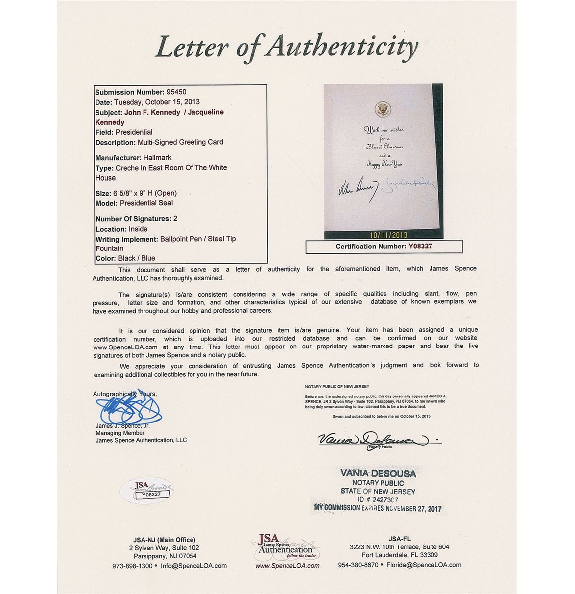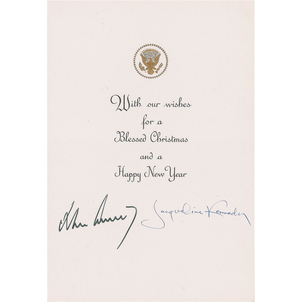 Rare official White House Hallmark Christmas card from 1963, featuring an image of a nativity scene on the front, measuring 4.5 x 6.5 closed, signed inside in bold ink as president, “John Kennedy,” and as first lady, “Jacqueline Kennedy.” The image on the front is identified as “Creche in East Room, The White House,” and a gilt-embossed presidential seal and engraved holiday greeting appear above the signatures, reading: “With our wishes for a Blessed Christmas and a Happy New Year.” In fine condition. Accompanied by a full letter of authenticity from JSA. The Kennedys ordered a few different variations of these cards from Hallmark, some with “Blessed Christmas” omitted, and most with facsimile signatures; in late November, 500 blank versions arrived at the White House while the Kennedys were on a trip to Florida. After returning on the evening of the 18th, both the president and first lady began to sign the cards at their leisure before leaving for their ill-fated trip to Texas on the 20th. Given the tragic events, none of the 1963 Kennedy Christmas cards were ever sent and these dual-signed cards were relatively unknown, even to the Kennedy Library, until the mid-1980s. According to Mary Evans Seeley’s book Season's Greetings from the White House, fewer than 30 of the dual-signed cards are known to exist, making them the rarest Christmas format ever signed by a president and first lady.