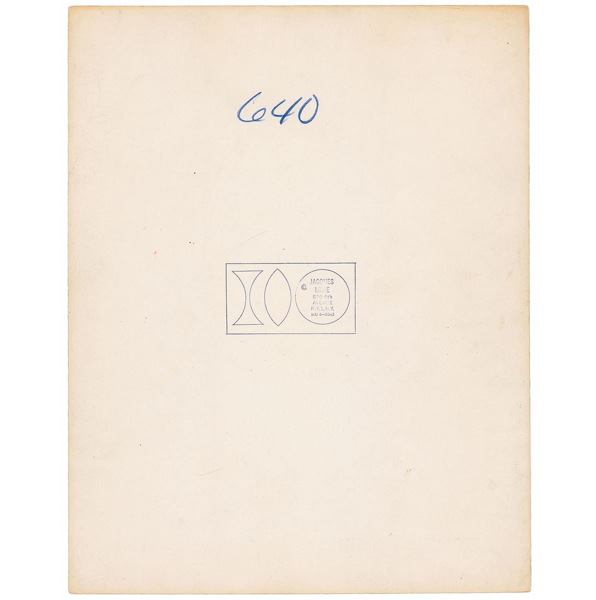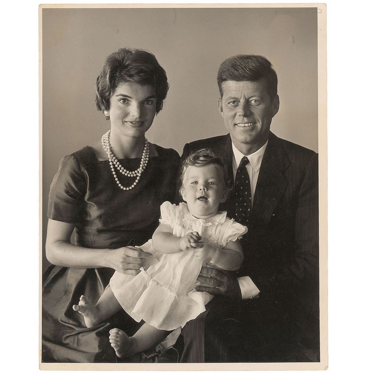 Iconic matte-finish 11 x 14 photograph of the first family, showing President John F. Kennedy, Jacqueline, and Caroline together, unsigned. The reverse bears Lowe’s photographer’s stamp, reading: “Jacques / Lowe / 830 6th / Avenue / N.Y. 1, N.Y. / MU 4-0043.” In very good condition, with scattered creases, a thin band of adhesive remnants to the upper left corner, edgewear, and some faint toning. Lowe began working as John F. Kennedy’s campaign photographer in 1958 and documented his presidential administration until 1962. Shortly after Lowe passed away in early 2001, his archive of negatives was destroyed with the World Trade Center.