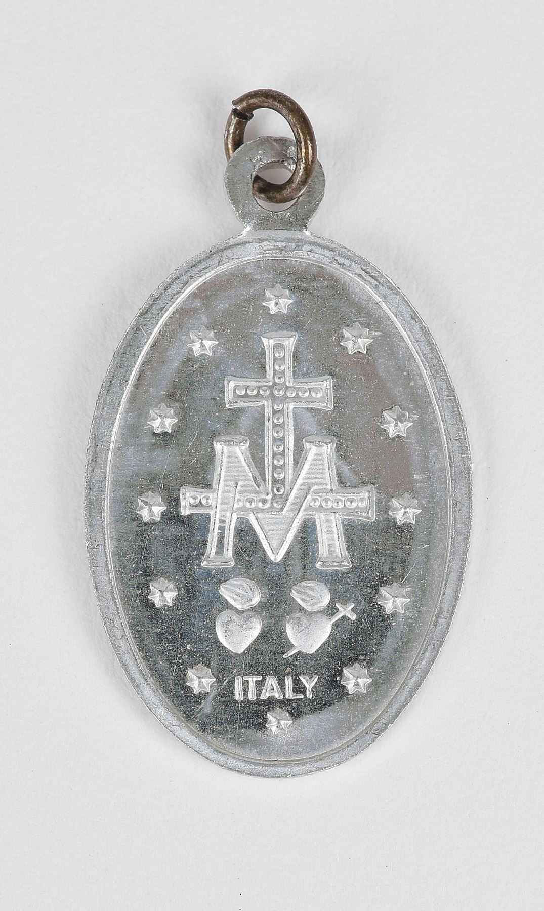 Silver-finish Miraculous Medal (Medal of Our Lady of Graces) gifted to President-elect John F. Kennedy and Jacqueline Kennedy upon the birth of their son John F. Kennedy, Jr., on November 25, 1960. Measuring .5 x .75, the front of the oval medallion depicts the Virgin Mary with outspread cloak encircled with Italian text: "Mary conceived without sin, Pray for us who have recourse to thee"; and the reverse features the Marian cross and marked "Italy" below. In fine condition. Accompanied by a letter of provenance from Mary Barelli Gallagher, the secretary to Senator John F. Kennedy and then later to First Lady Jackie Kennedy, in part: "This baby gift is one of the many gifts that had arrived daily to the home of President–Elect and Mrs. John F. Kennedy, 3307 N St. N. W., Georgetown, Washington, D.C. on the occasion of John Jr.'s Birth…Mrs. Kennedy would ask that I prepare a letter of thanks to the sender for her to sign, and this is one of the gifts that she offered me to take home. I donated the vast majority of these gifts to various charities, others I gave away to friends, relatives, etc., keeping the more interesting ones, such as this, for myself."