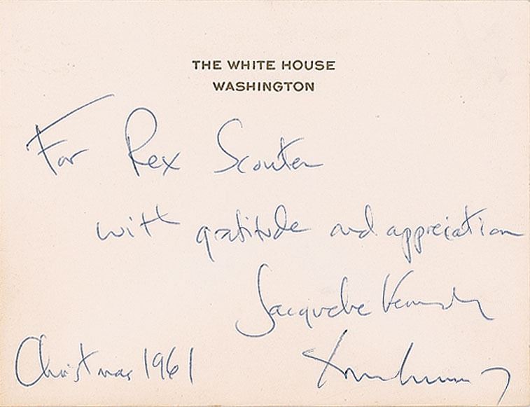 Very desirable White House card, 4.5 x 3.5, signed and inscribed in blue ballpoint, "For Rex Scouten, with gratitude and appreciation, Jacqueline Kennedy" and "John Kennedy," with the first lady adding to the lower left, "Christmas 1961." In very fine condition. After 13 years in the United States Secret Service, Rex Scouten served as an assistant White House usher from 1960 to 1969. He then became the White House Chief Usher, serving from March 1969 to January 1986, before assuming the role of White House Curator from 1986 to 1997; Scouten's time within the White House extended over 10 different presidential administrations, from Harry S. Truman to Bill Clinton.