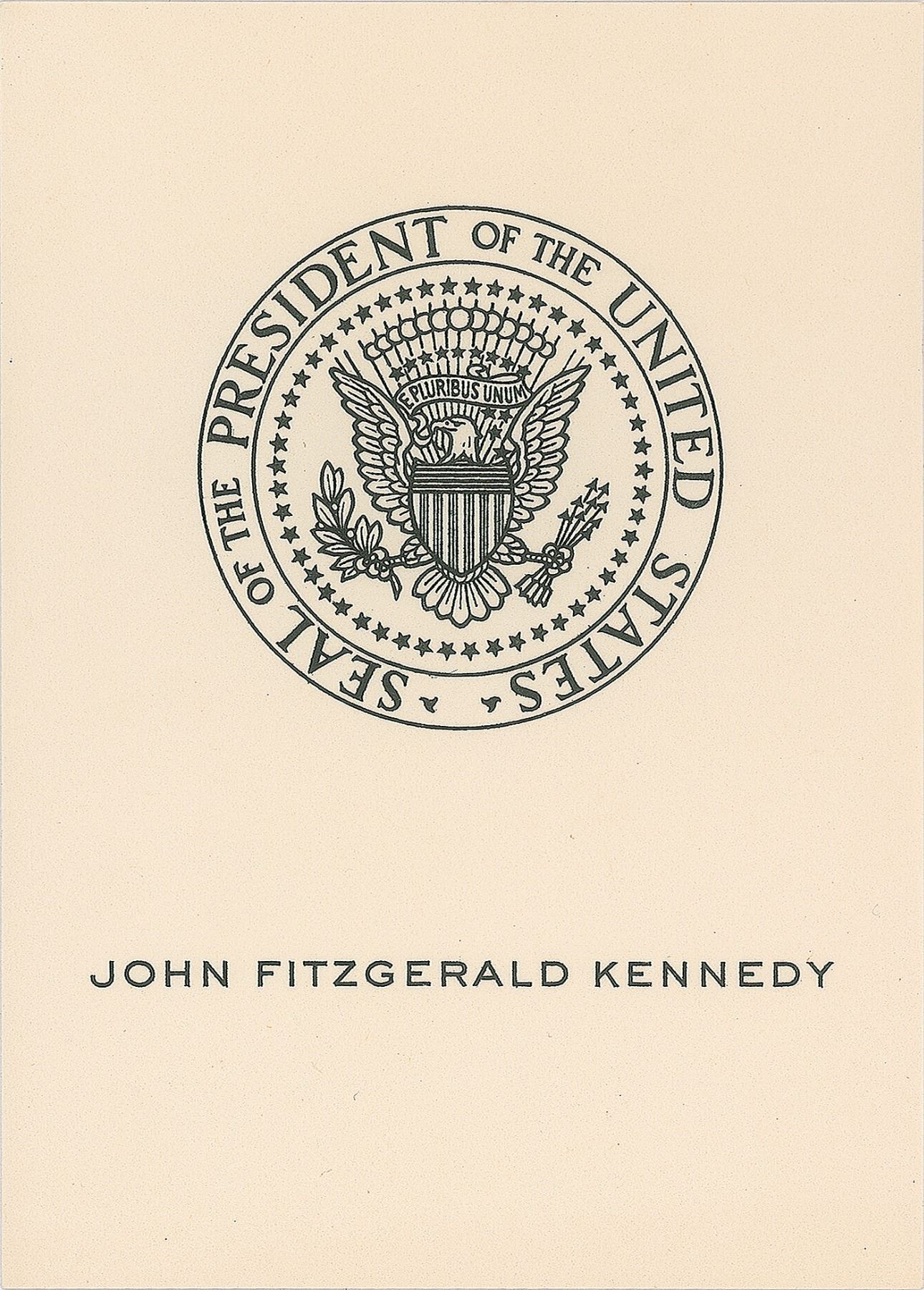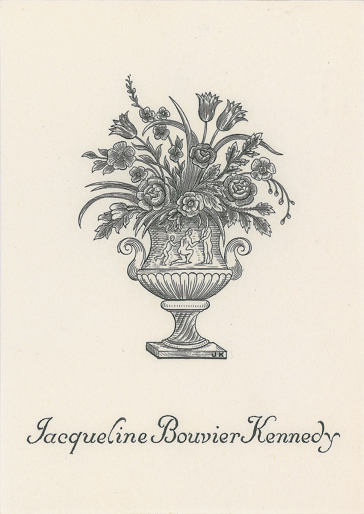 Sought-after pair of personalized bookplates for President John F. Kennedy and First Lady Jacqueline Kennedy, designed and crafted during their time in the White House. The JFK bookplate measures 3.25 x 4.5 and prominently features an embossed presidential seal with his full name below, “John Fitzgerald Kennedy”; the more delicate Jackie bookplate measures 2.75 x 3.75 and features a vase with floral bouquet, with initials “JK” on the base, and her full name below, “Jacqueline Bouvier Kennedy.” In overall very fine condition. Consignor notes that the bookplates originate from the collection of Mary Gallagher, the former personal secretary to Mrs. Kennedy from 1957 to 1964.
