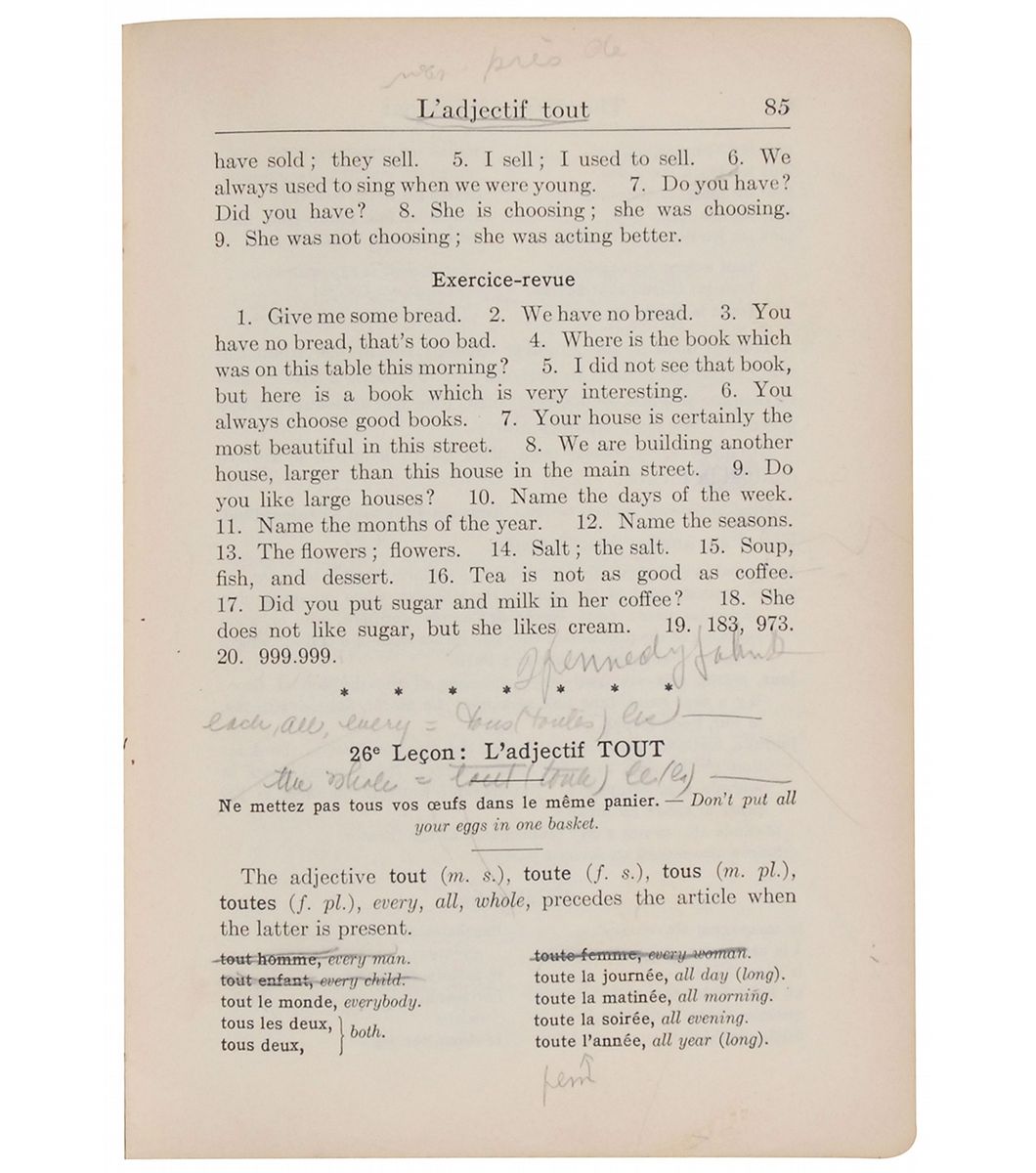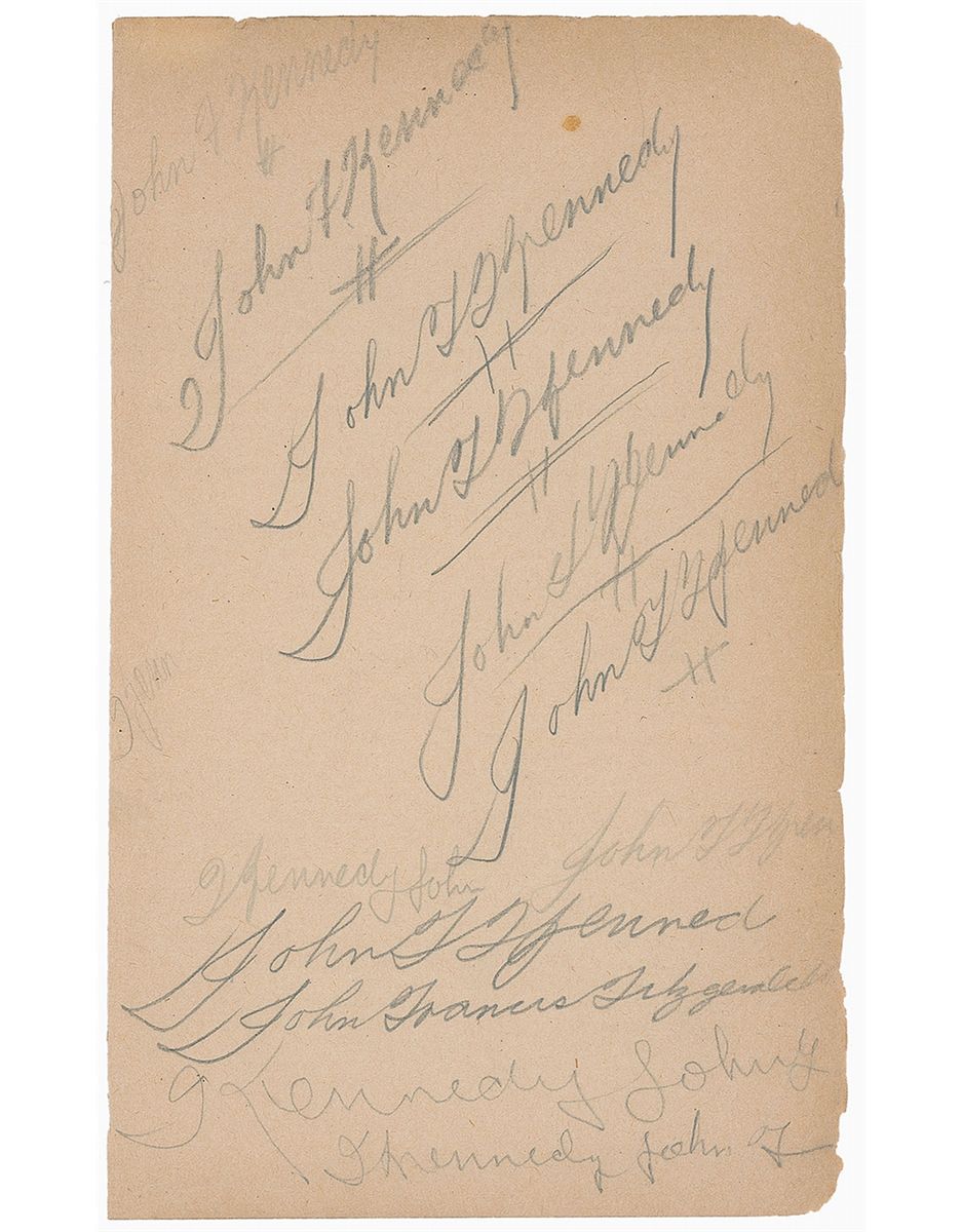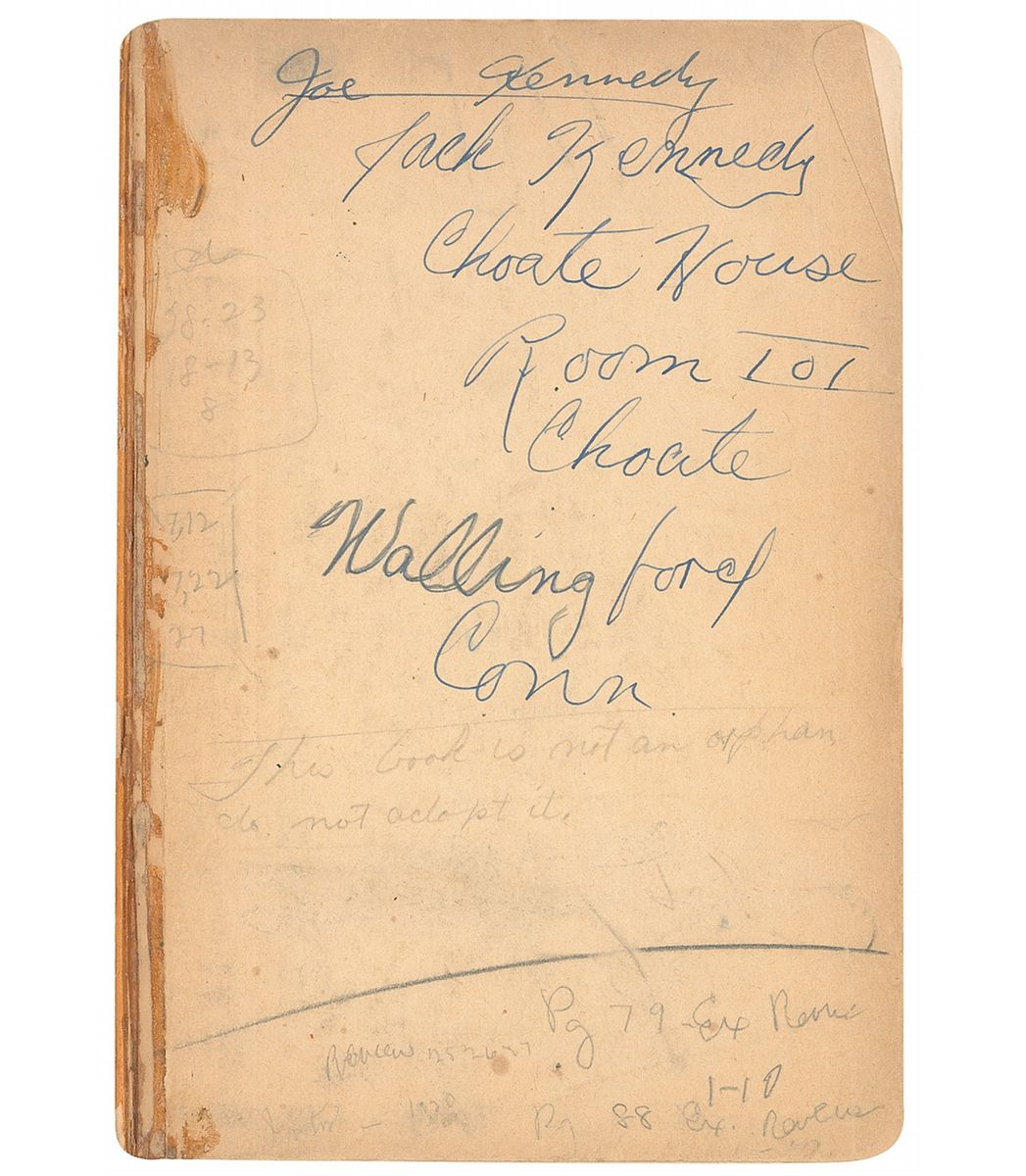 Signed book: The New Chardenal Complete French Course. Boston: Allyn and Bacon, 1929. Hardcover, 5.25 x 7.5, 450 pages, with a handsome custom-made clamshell book box. Signed in blue ink on the first free end page, “Joe Kennedy,” and “Jack Kennedy, Choate House, Room 101, Choate, Wallingford Conn.” The book is also heavily annotated in pencil throughout by Kennedy, who also adds several different variations of his signature, including, “John F. Kennedy“ (24 times), “Kennedy, John F.” (16 times), “J. Kennedy” (3 times), “John Francis Kennedy” (once), “Kennedy” (4 times), “John Francis Fitzgerald Kennedy” (one time). One of the signatures in incorporated into his complete address, “Kennedy, John F., 2921 Pondfield Rd., Bronxville, N. Y.” Kennedy has drawn a face in the arch of a photo of La Porte St. Denis a Paris, and tracing an image of Le Pantheon a Paris on the opposite page. Autographic condition: paperclip impressions over portion of both signatures, uniform toning to signed page, multiple pencil notations to signed page, as well as some adhesive remnants along left edge, small portion of “Wallingford” traced over in Book condition: G-/None. Brown cloth-covered boards; heavy wear to edges, with chips/tears in cloth (mostly at corners and spine-ends); spine sunned; hinges cracked; first and last few pages are detached; heavy marking throughout; soiled and slightly yellowed.